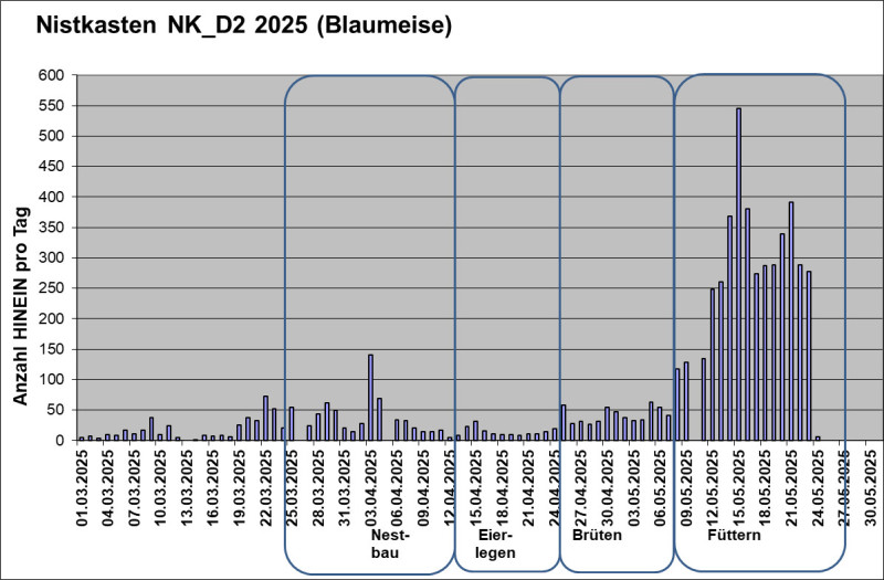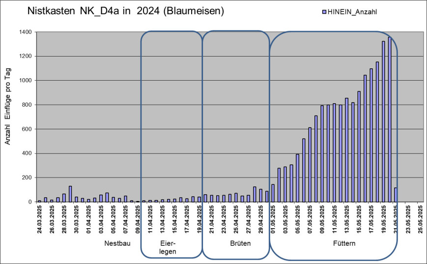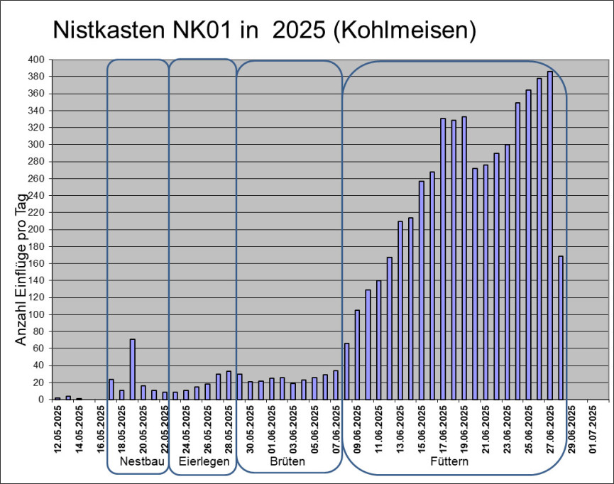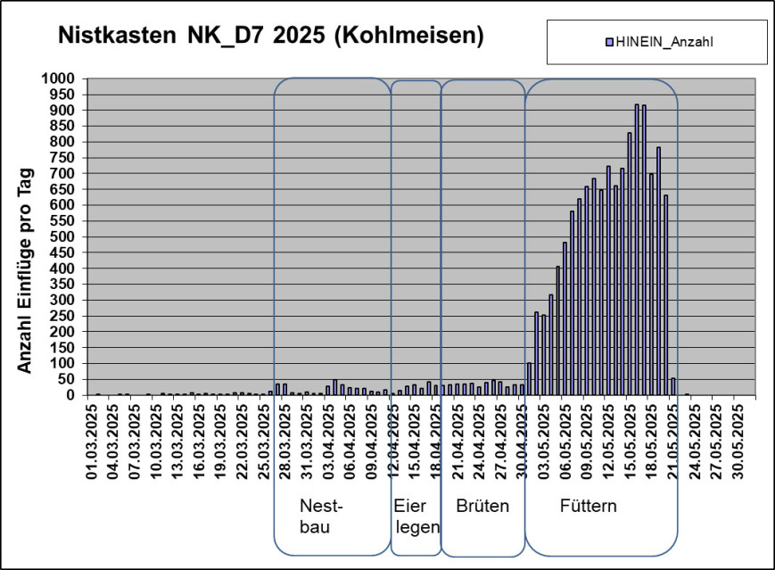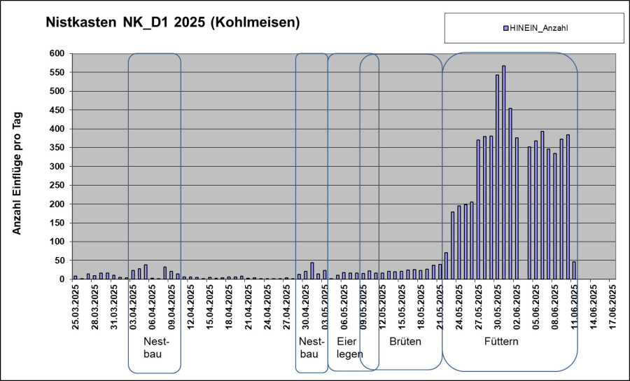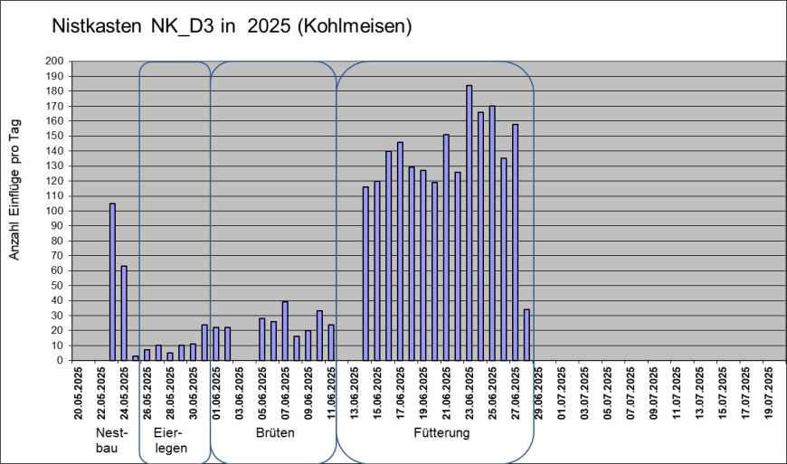Die Abbildung zeigt die Anzahl der täglichen Einflüge in den Nistkasten NK_D1. Die Kohlmeisen haben acht Eier gelegt. Sie brüten seit 09.05.2025 und haben zu Beginn des Brütens weitere drei Eier gelegt. Am 21.05.2025 um 19:00 Uhr ist der erste von acht Jungvögel geschlüpft. Einen Prädator-Angriff am 02.06.2025 überlebten nur drei Junge. Diese sind am 11.06.2025 ausgeflogen.