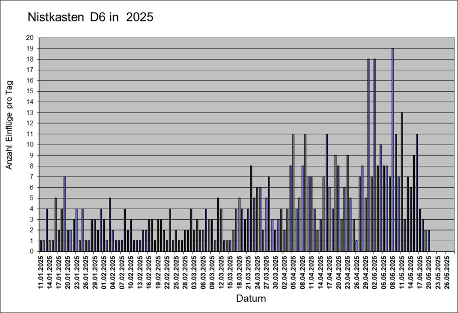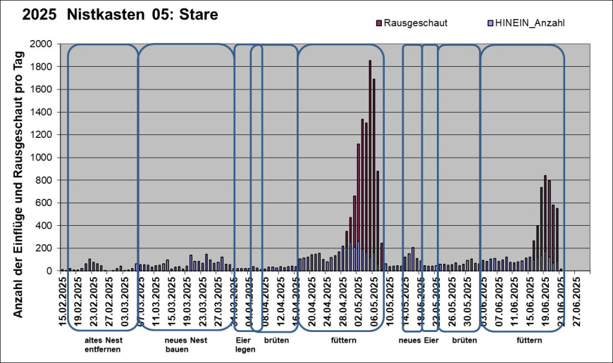 Das Bild zeigt wie oft die Stare nach der Ankunft am 08.02.2025 in den Nistkasten flogen. Die Stare haben das alte Nestmaterial entfernt und ab 06.03.2025 transportierten sie neues Nestmaterial in den Nistkasten. Die Stare haben sechs Eier gelegt. Bereits während des Legens der letzten Eier haben sie mit dem Brüten begonnen. Am 17.04.2025 schlüpften sechs junge Stare. Während der Regentage vom 23. bis 26.05.2025 flogen die Stare weniger häufig in den Nistkasten. Seit 29.04.2025 strecken die Jungvögel ihre Köpfe durch das Einflugloch noch außen und werden von außen gefüttert. Deshalb enthält das Bild ab diesem Datum die Anzahl der Einflüge (hauptsächlich um den Kot zu entfernen) und die Anzahl wie oft die Jungvögel herausgeschaut haben. Nicht bei jedem Herausschauen werden sie gefüttert. Am 08.05.2025 flogen die sechs Jungvögel aus.