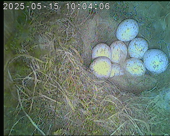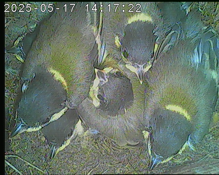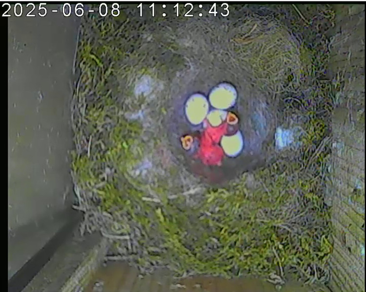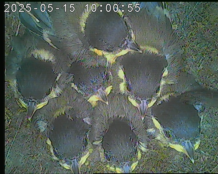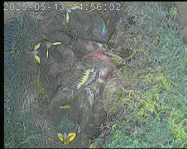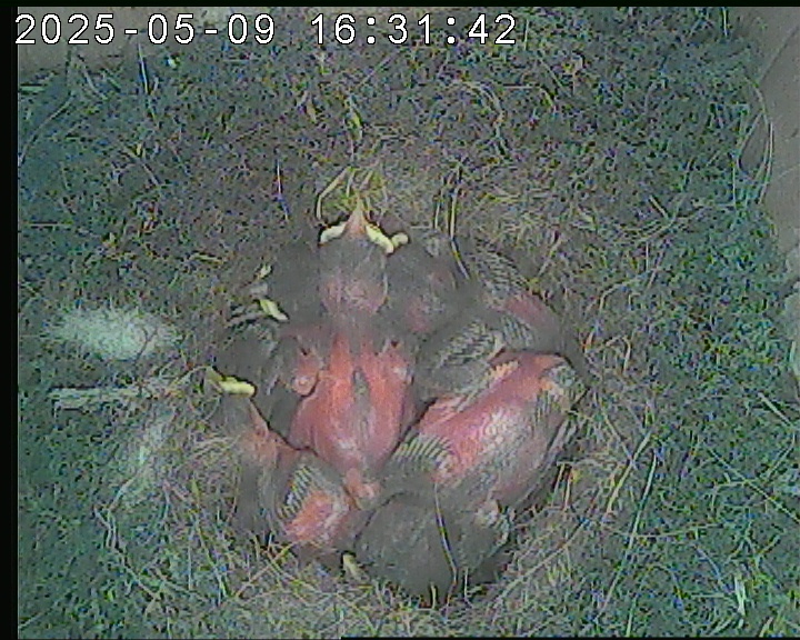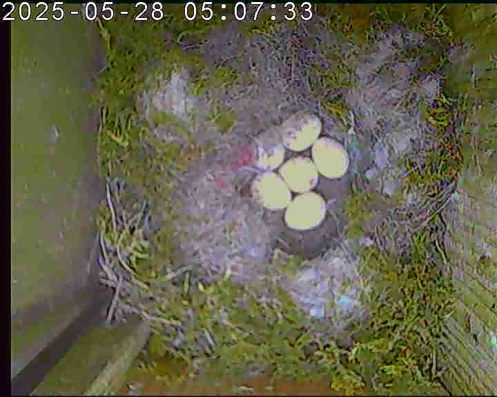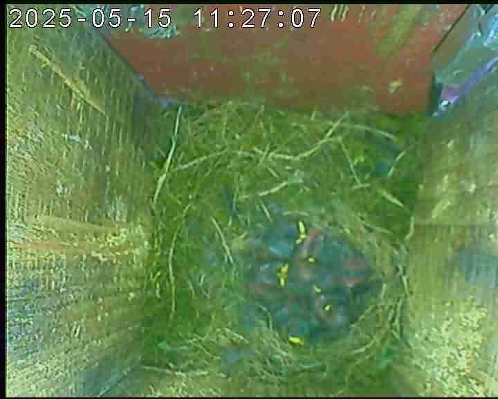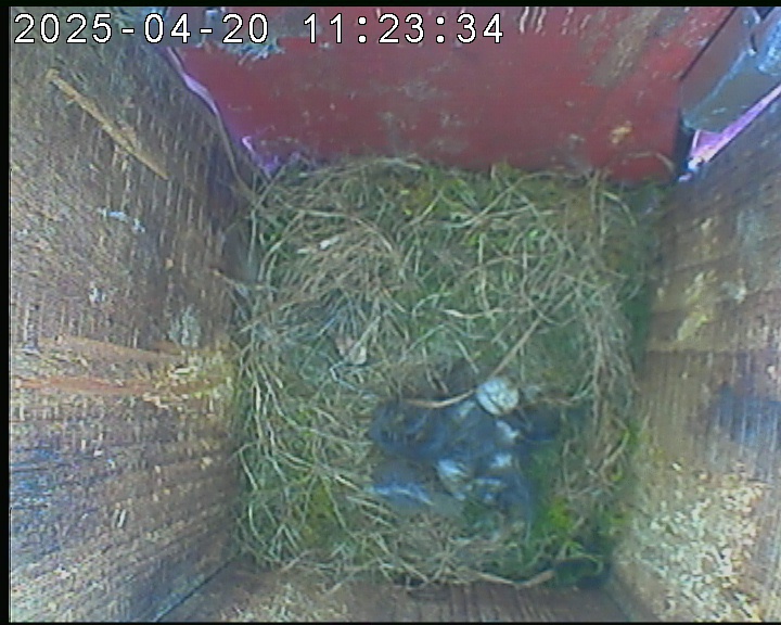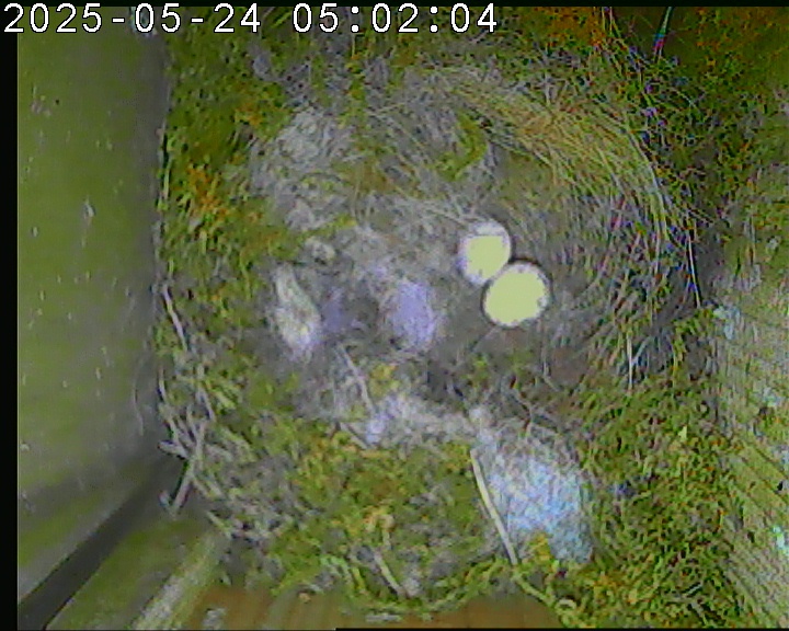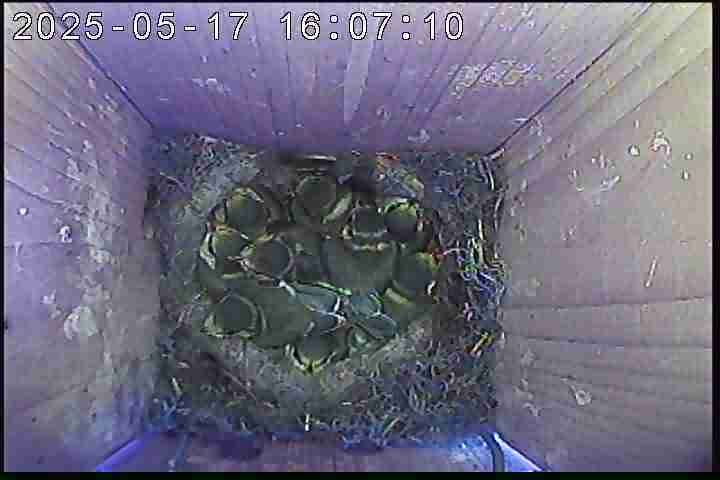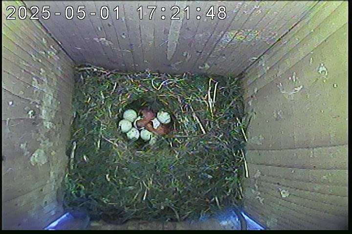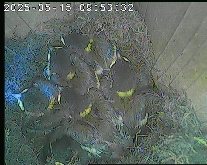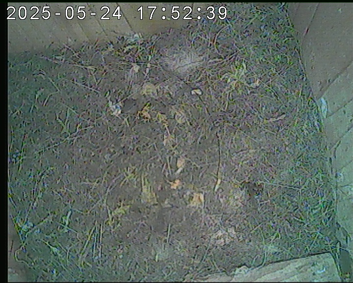 Der Boden ist vollständig mit Moos ausgelegt. Es liegen zwölf Eier im Nest. Die Jungvögel sind geschlüpft. Vom 09.05.2025 15:20 Uhr bis 11.05.2025 10:34 Uhr gab es eine technische Störung, daher die Lücke. Am 24.05.2025 lagen nur noch vier tote Jungvögel im Nest. Vermutlich gab es einen Prädator-Angriff.