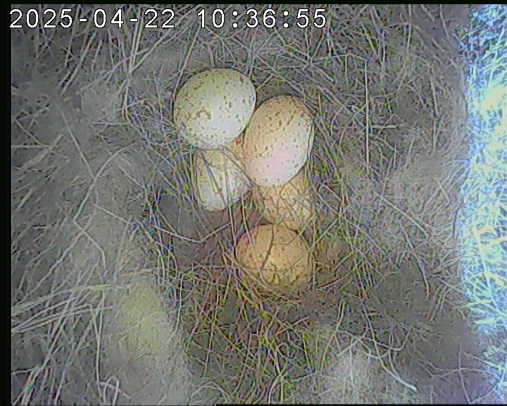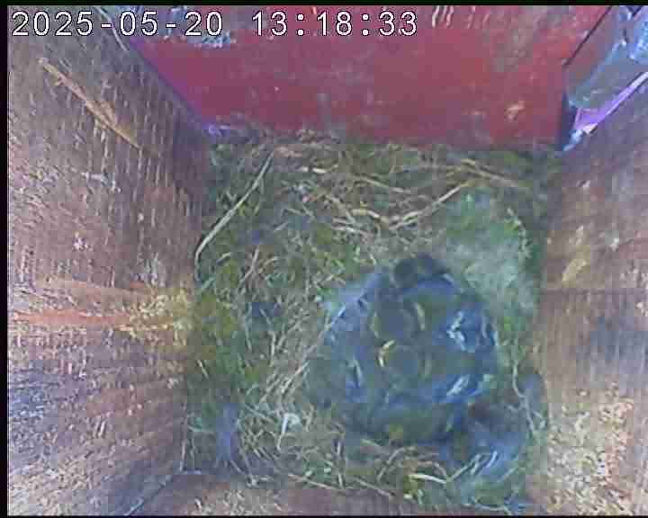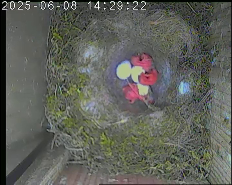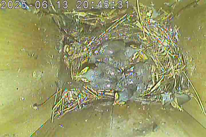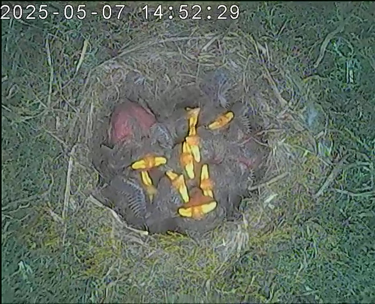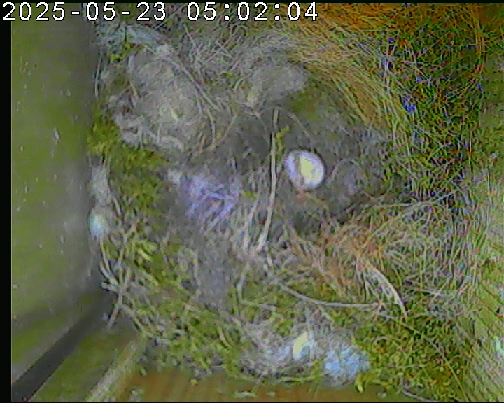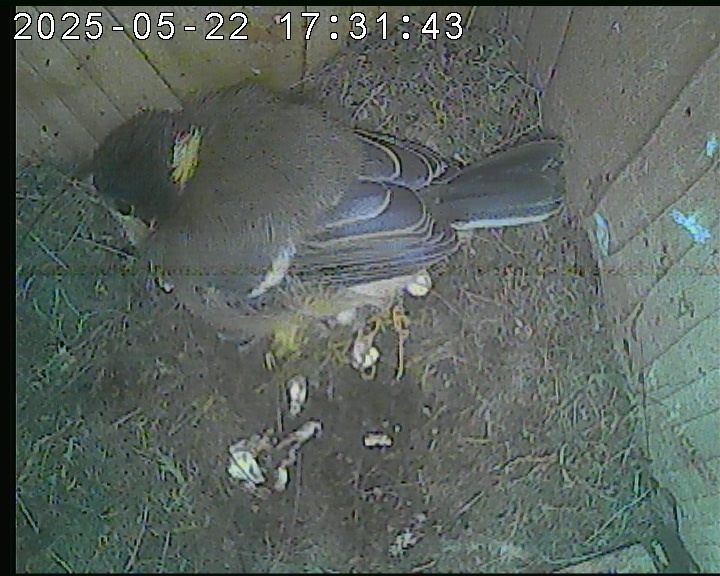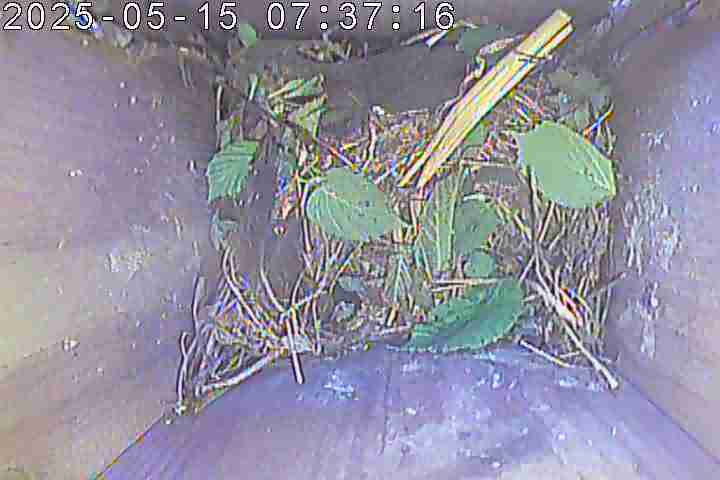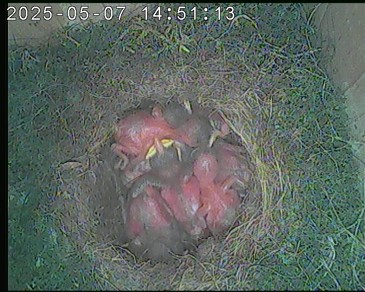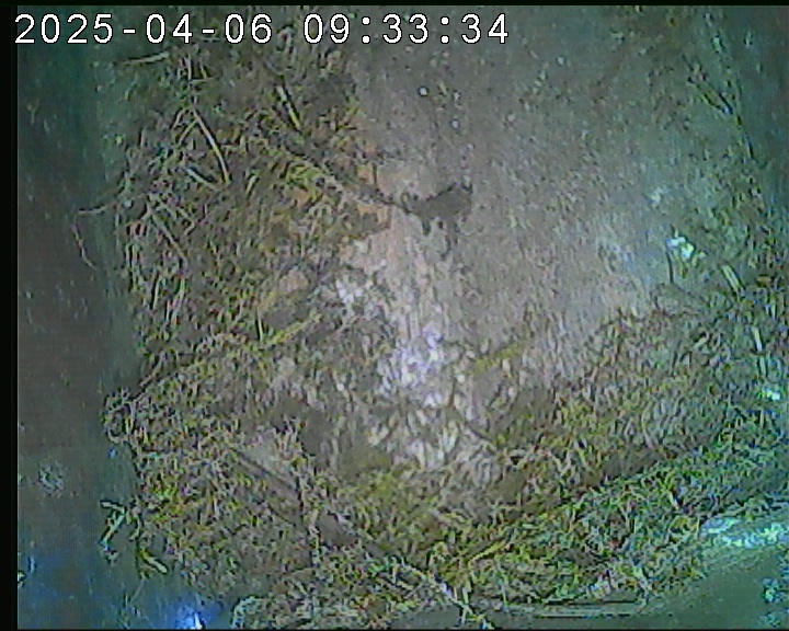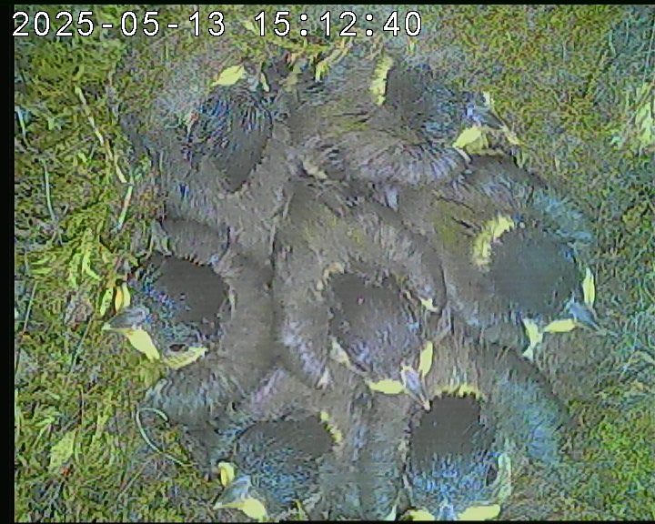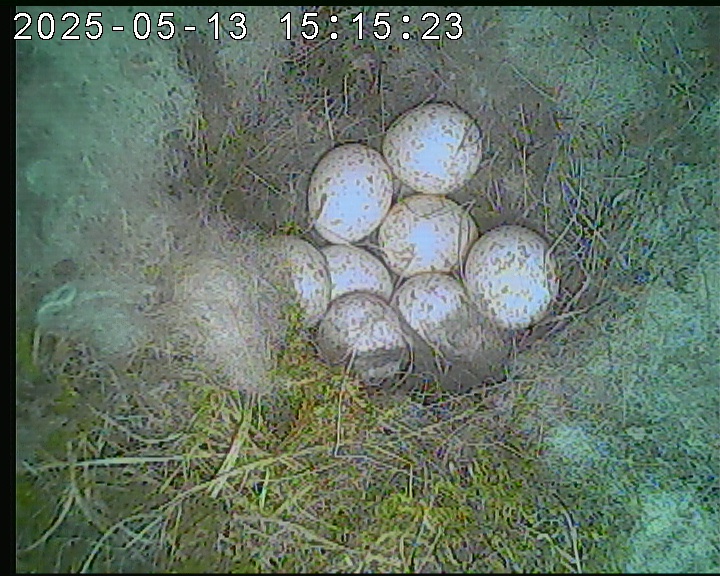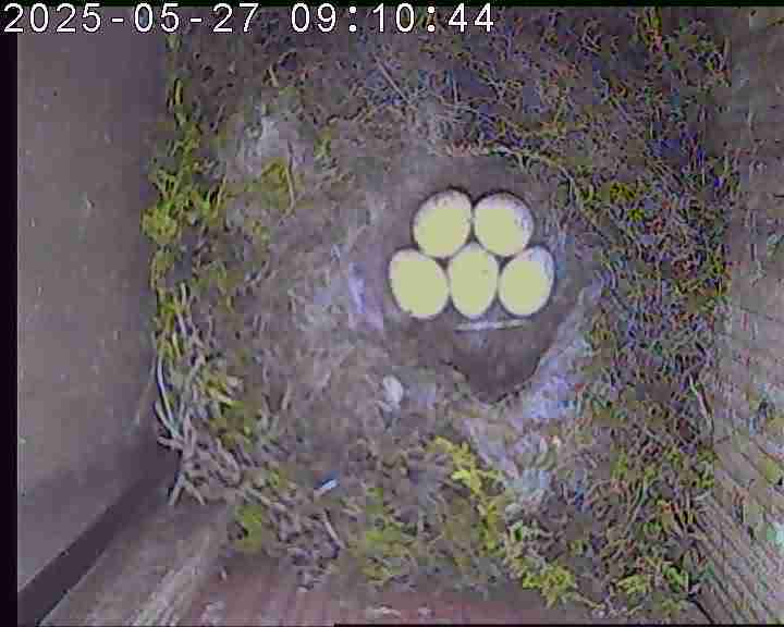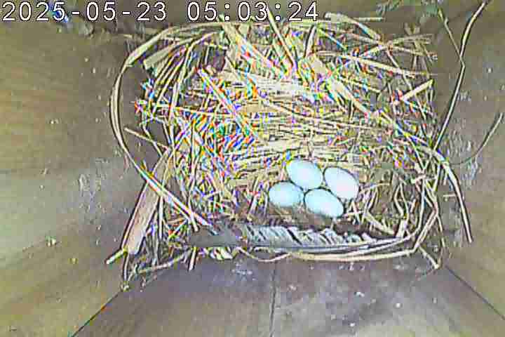 Der Boden ist vollständig mit Moos ausgelegt. Es liegen zwölf Eier im Nest. Die Jungvögel sind geschlüpft. Vom 09.05.2025 15:20 Uhr bis 11.05.2025 10:34 Uhr gab es eine technische Störung, daher die Lücke. Am 24.05.2025 lagen nur noch vier tote Jungvögel im Nest. Vermutlich gab es einen Prädator-Angriff.