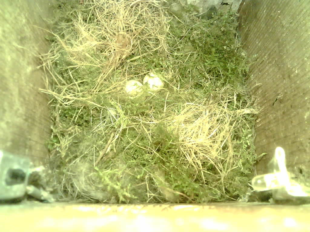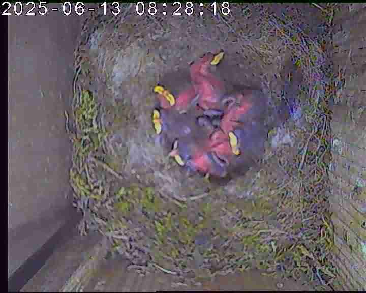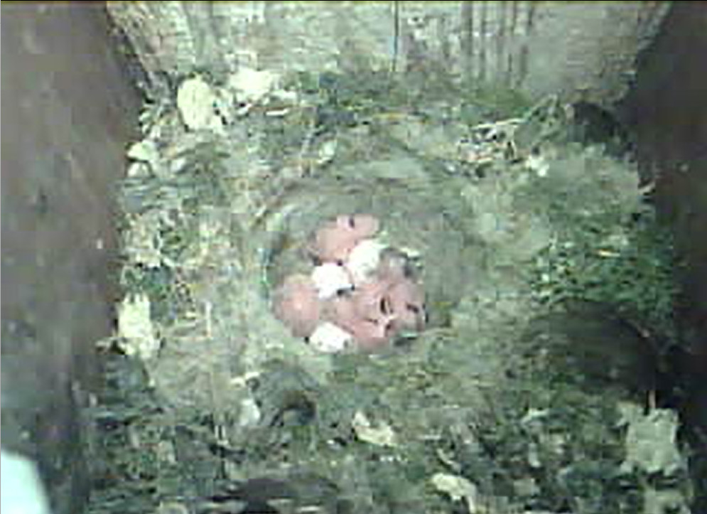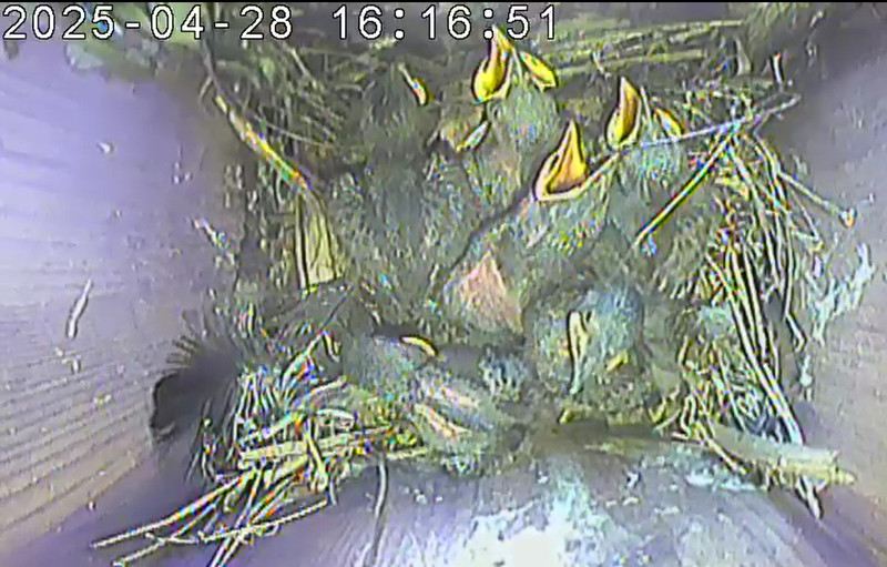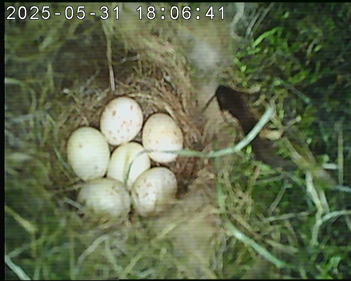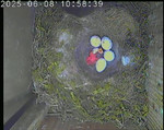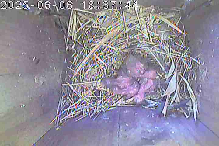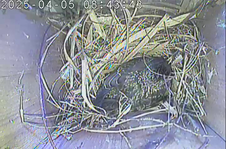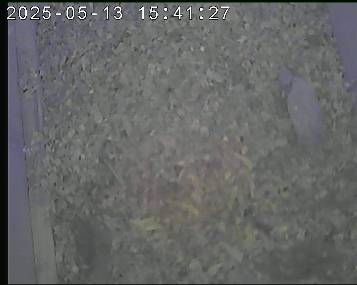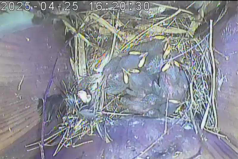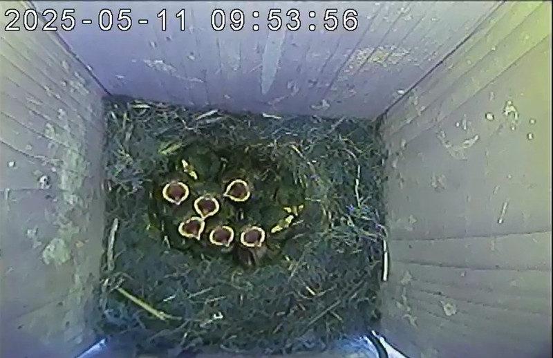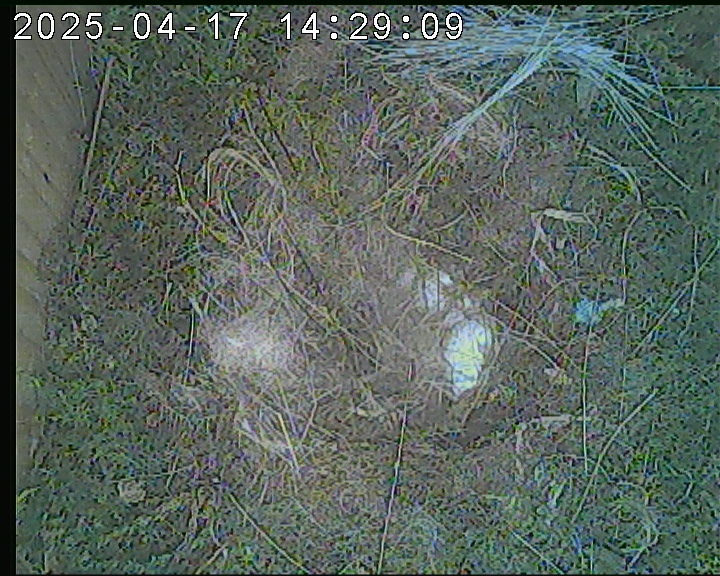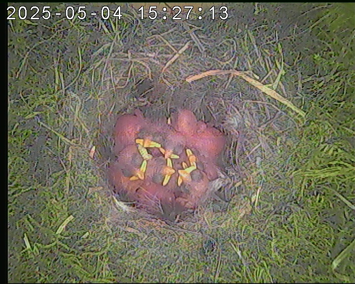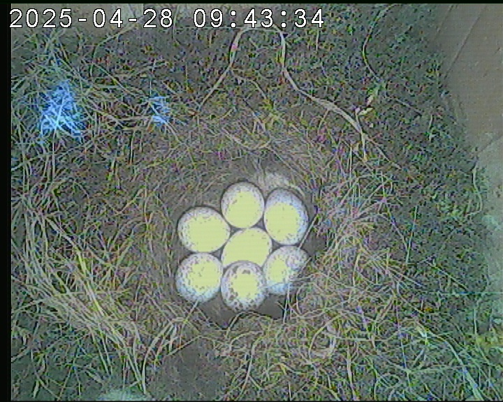Der Boden ist vollständig mit Moos ausgelegt. Es liegen zwölf Eier im Nest. Die Jungvögel sind geschlüpft. Vom 09.05.2025 15:20 Uhr bis 11.05.2025 10:34 Uhr gab es eine technische Störung, daher die Lücke. Am 24.05.2025 lagen nur noch vier tote Jungvögel im Nest. Vermutlich gab es einen Prädator-Angriff.