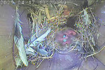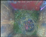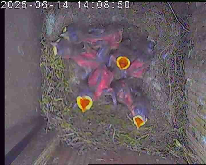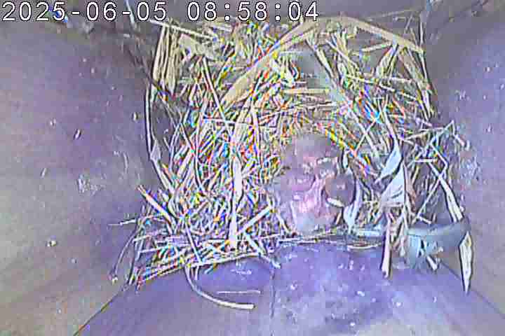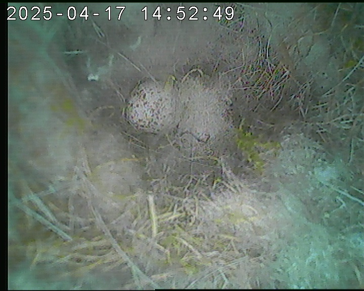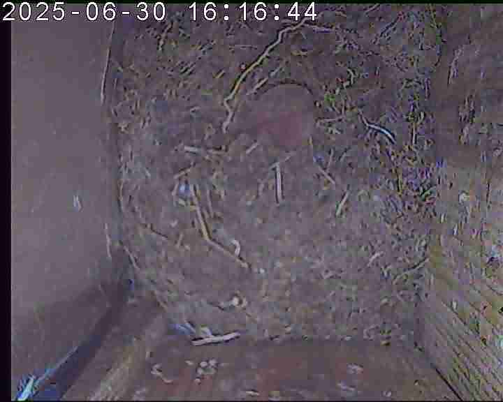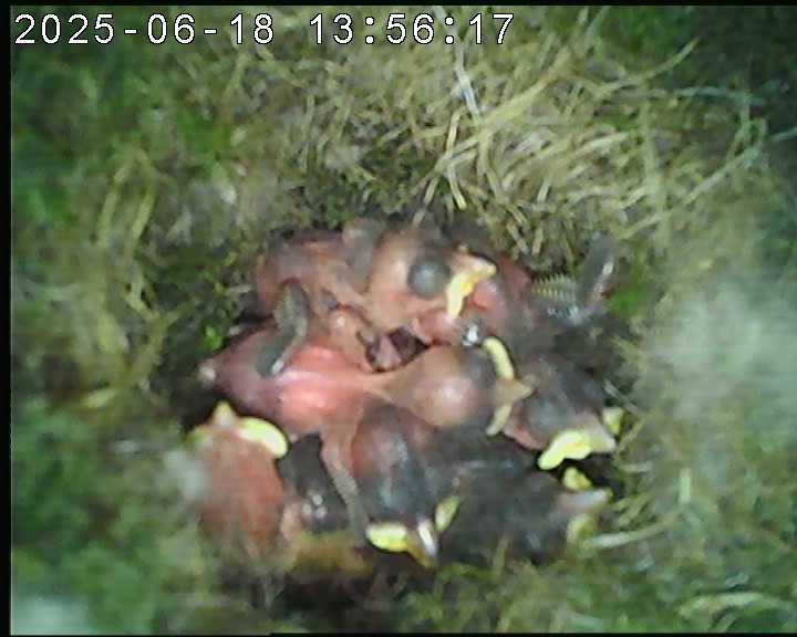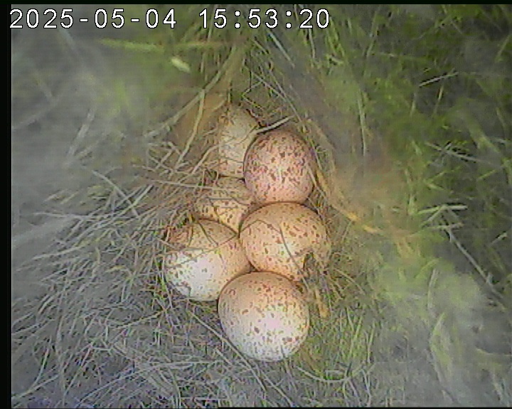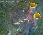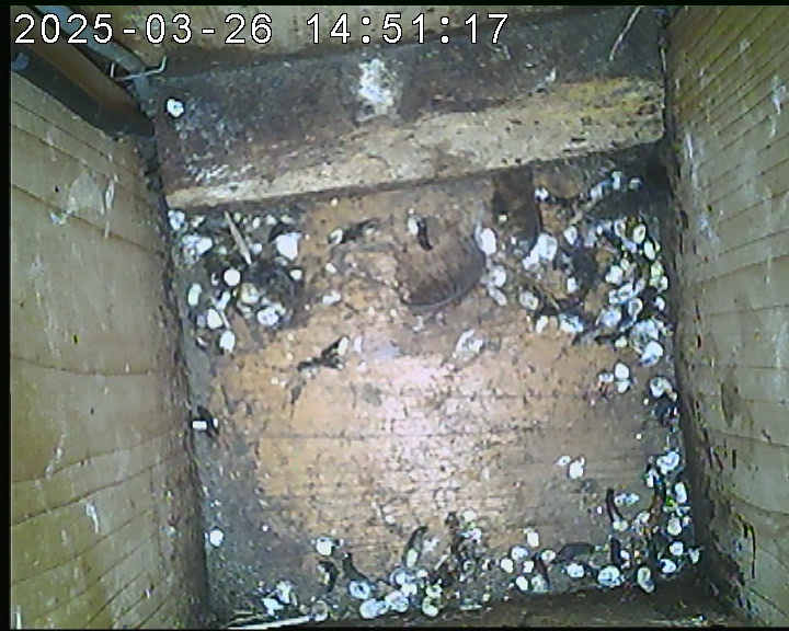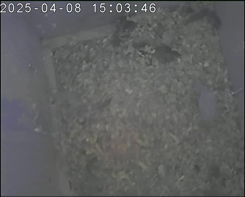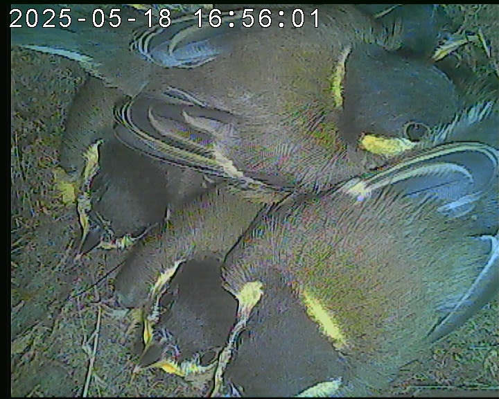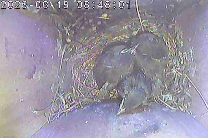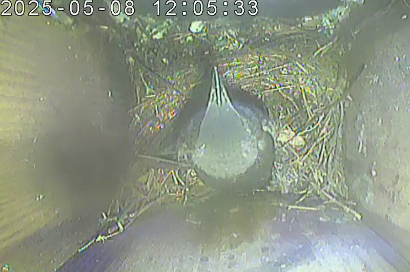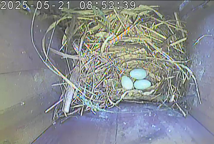 Der Boden ist vollständig mit Moos ausgelegt. Es liegen zwölf Eier im Nest. Die Jungvögel sind geschlüpft. Vom 09.05.2025 15:20 Uhr bis 11.05.2025 10:34 Uhr gab es eine technische Störung, daher die Lücke. Am 24.05.2025 lagen nur noch vier tote Jungvögel im Nest. Vermutlich gab es einen Prädator-Angriff.