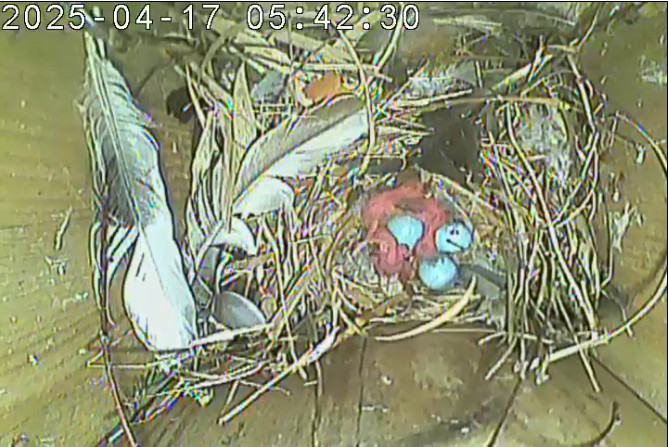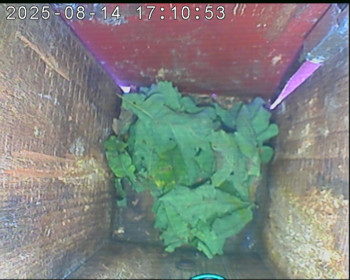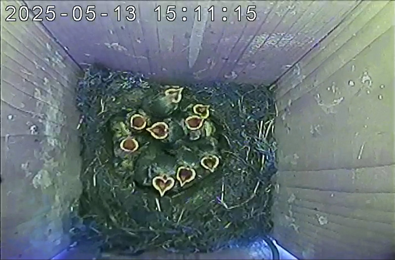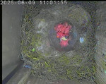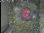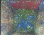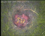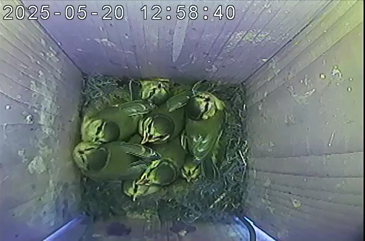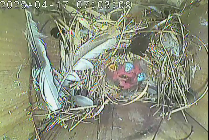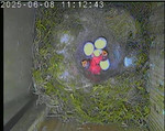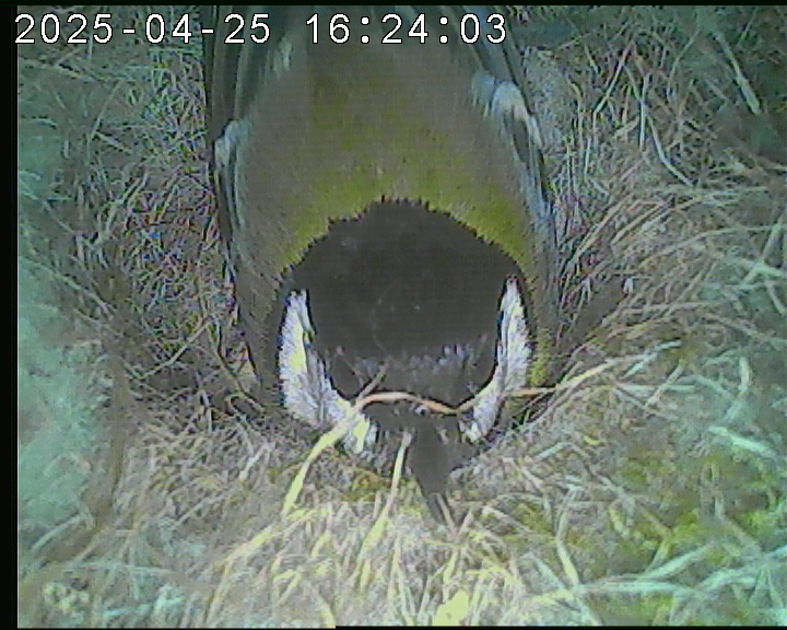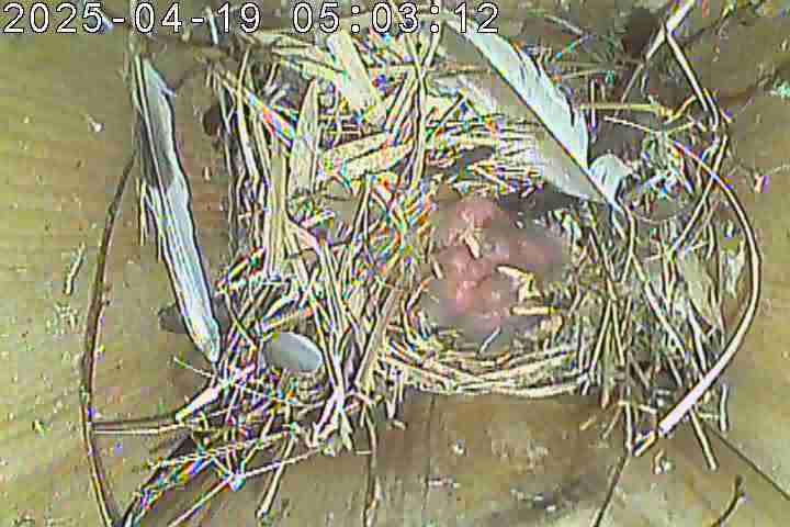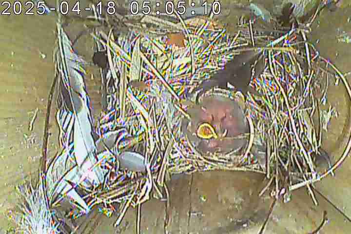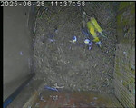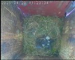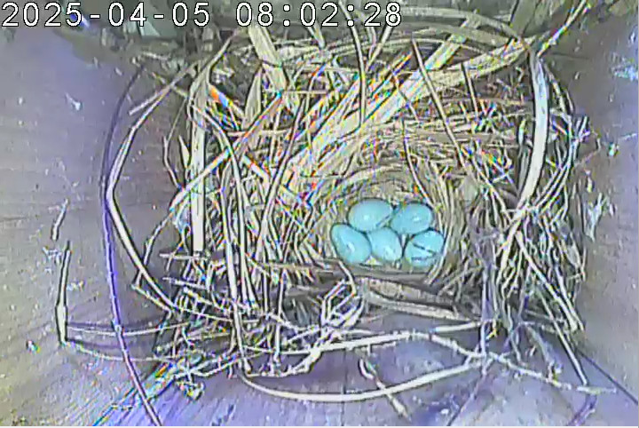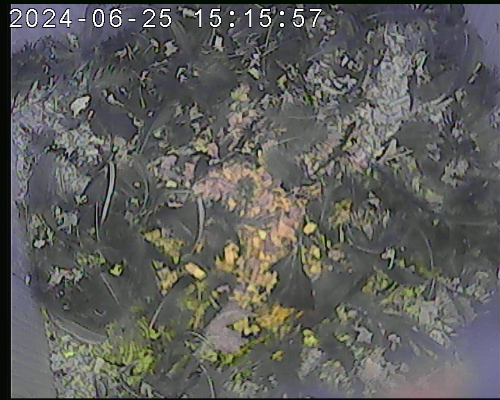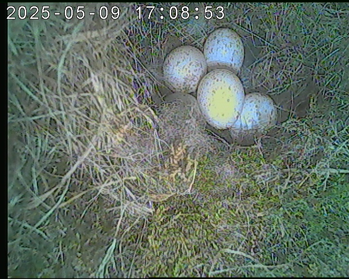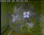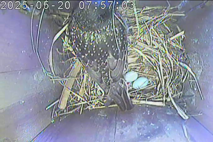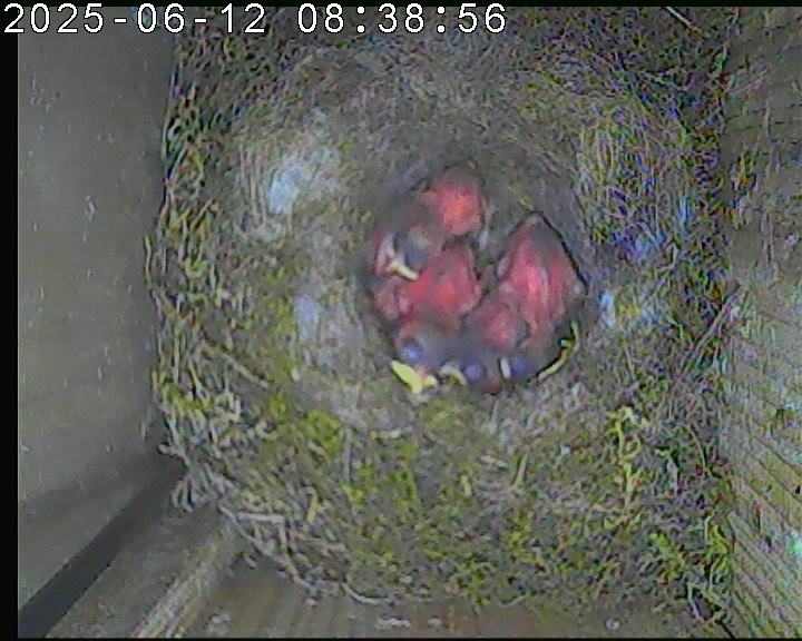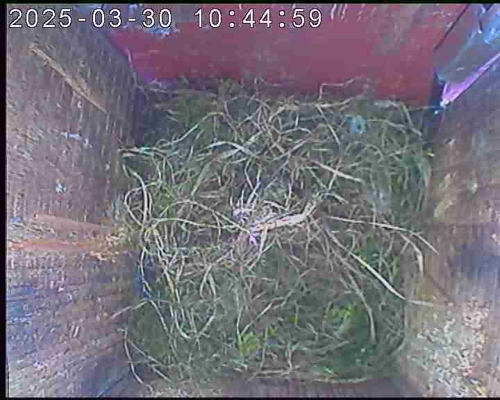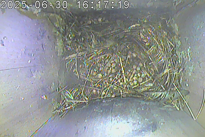 Der Boden ist vollständig mit Moos ausgelegt. Es liegen zwölf Eier im Nest. Die Jungvögel sind geschlüpft. Vom 09.05.2025 15:20 Uhr bis 11.05.2025 10:34 Uhr gab es eine technische Störung, daher die Lücke. Am 24.05.2025 lagen nur noch vier tote Jungvögel im Nest. Vermutlich gab es einen Prädator-Angriff.