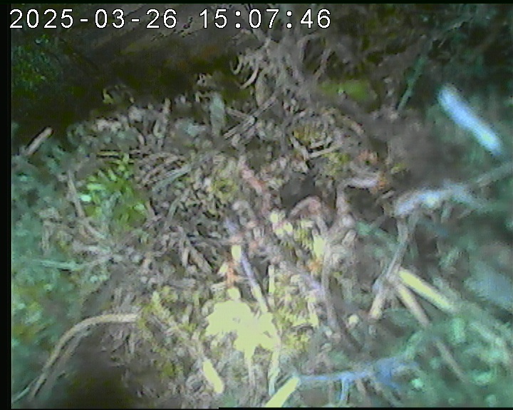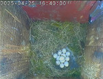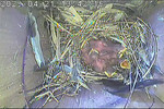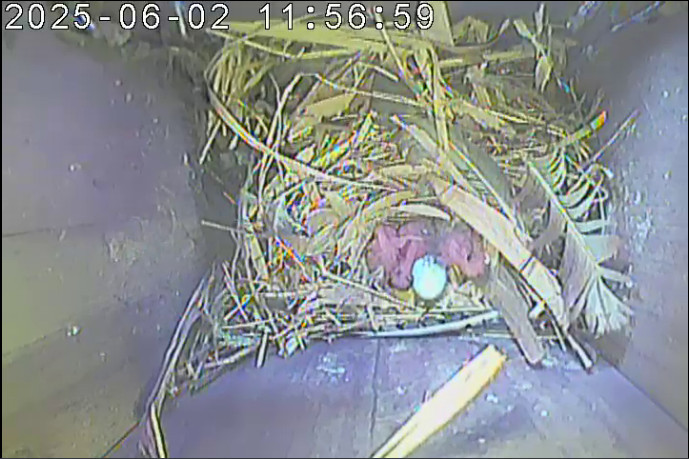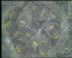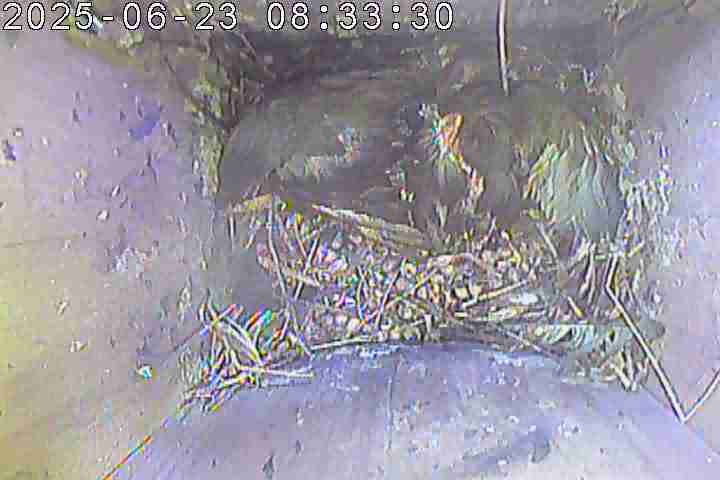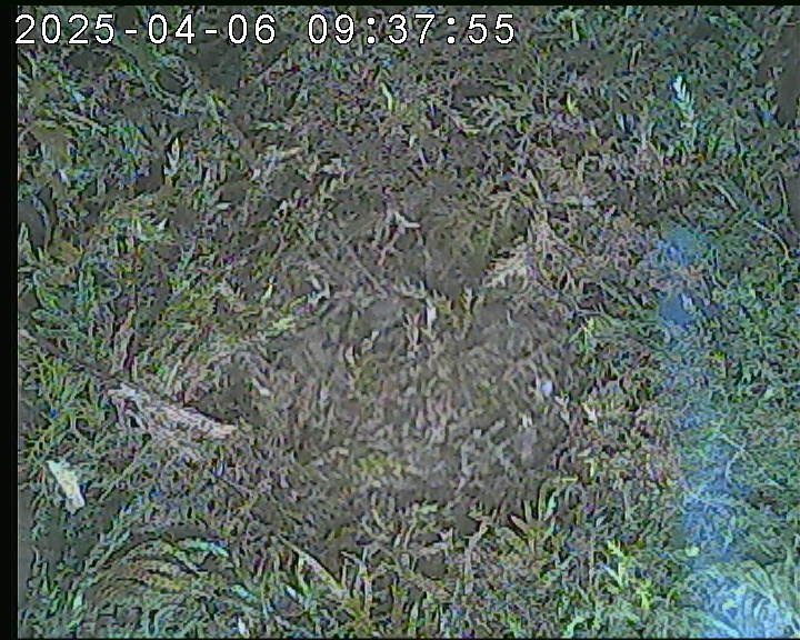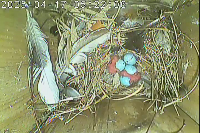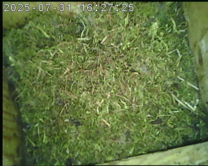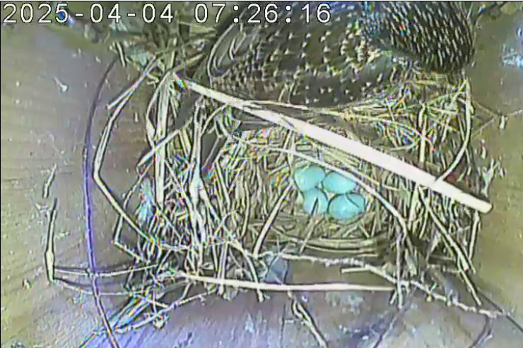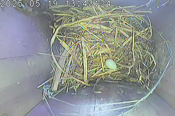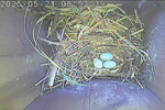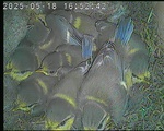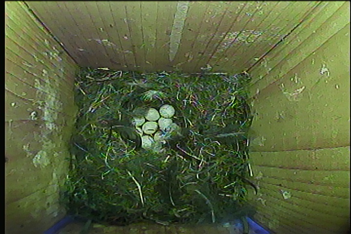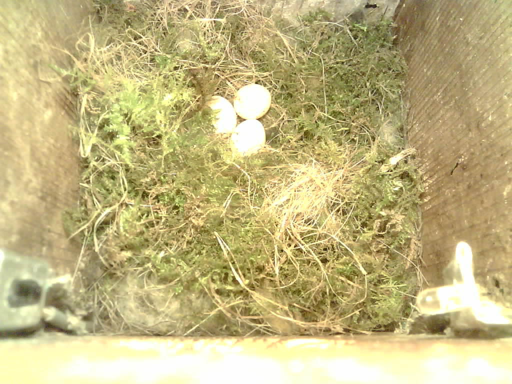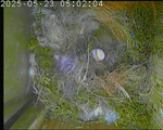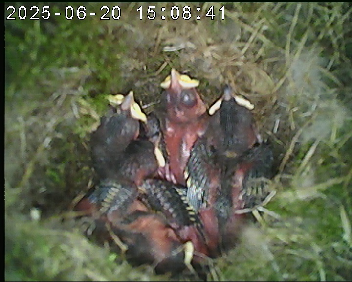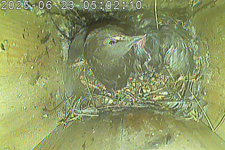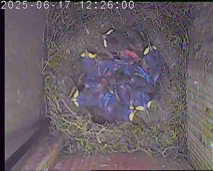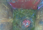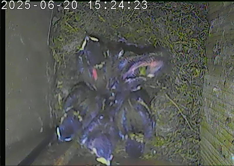 Der Boden ist vollständig mit Moos ausgelegt. Es liegen zwölf Eier im Nest. Die Jungvögel sind geschlüpft. Vom 09.05.2025 15:20 Uhr bis 11.05.2025 10:34 Uhr gab es eine technische Störung, daher die Lücke. Am 24.05.2025 lagen nur noch vier tote Jungvögel im Nest. Vermutlich gab es einen Prädator-Angriff.