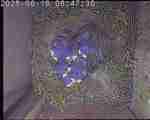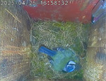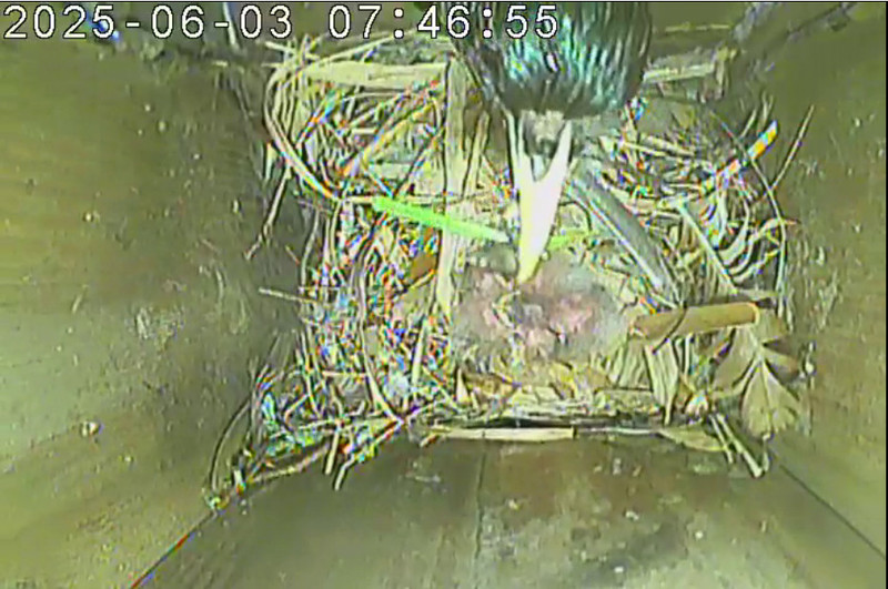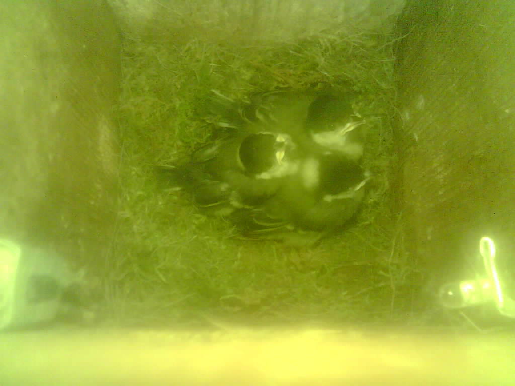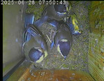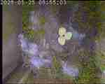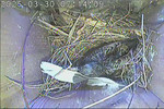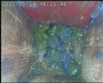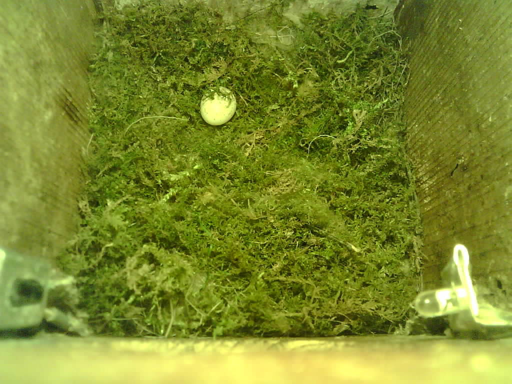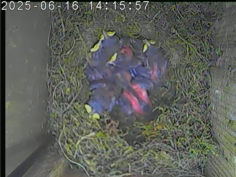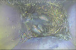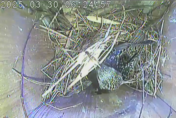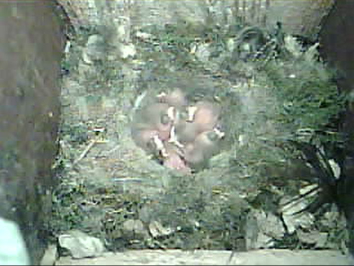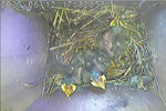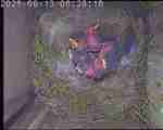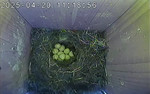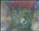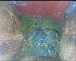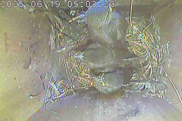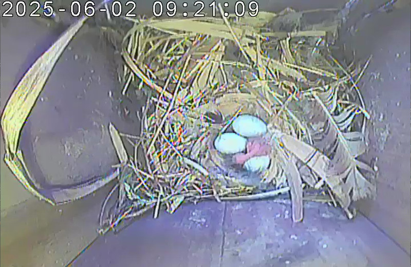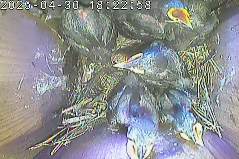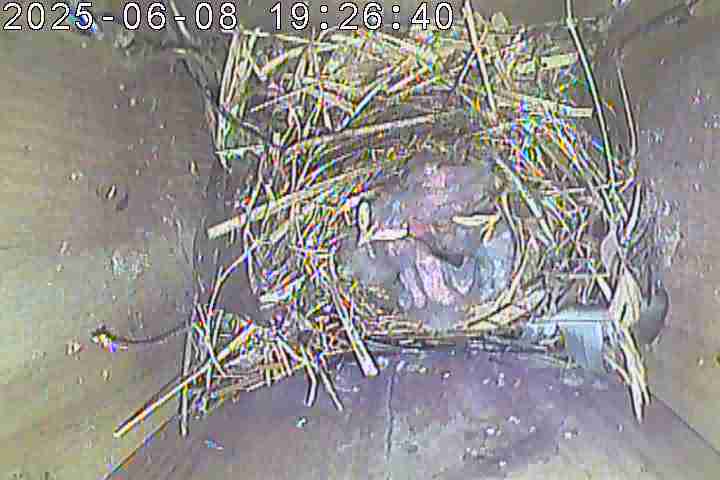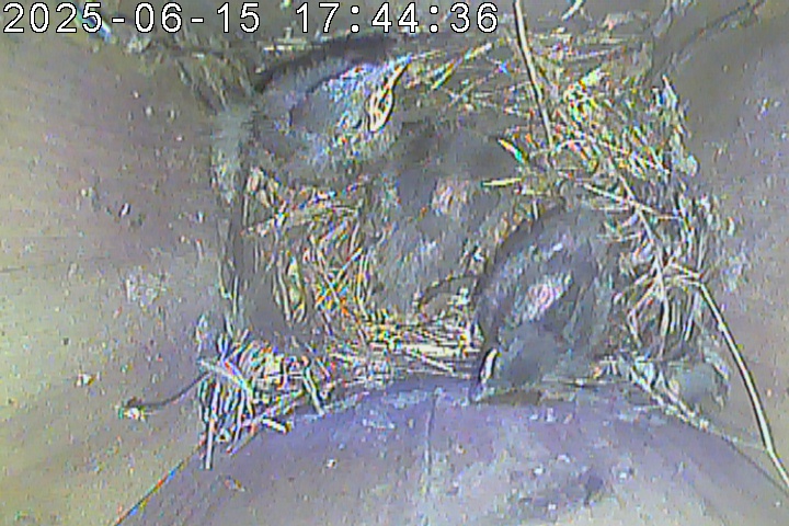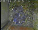 Der Boden ist vollständig mit Moos ausgelegt. Es liegen zwölf Eier im Nest. Die Jungvögel sind geschlüpft. Vom 09.05.2025 15:20 Uhr bis 11.05.2025 10:34 Uhr gab es eine technische Störung, daher die Lücke. Am 24.05.2025 lagen nur noch vier tote Jungvögel im Nest. Vermutlich gab es einen Prädator-Angriff.