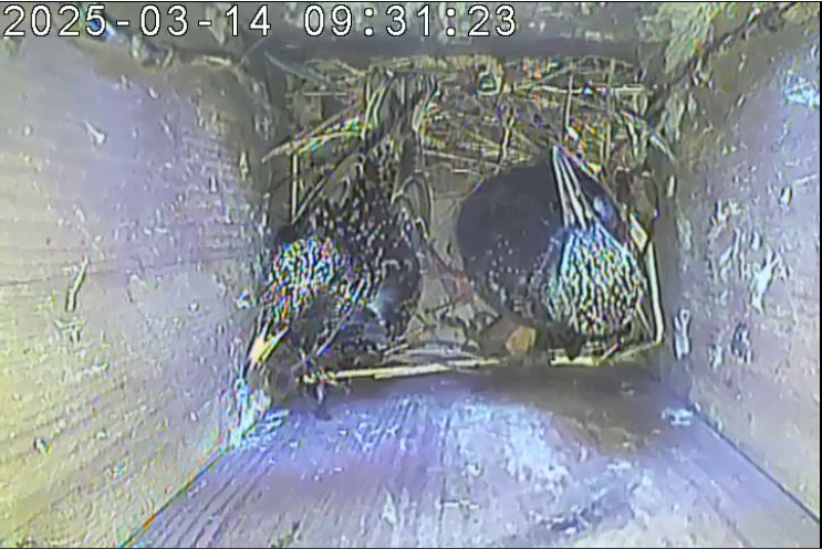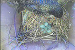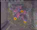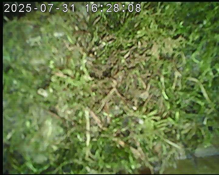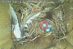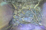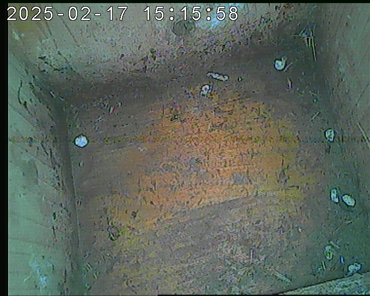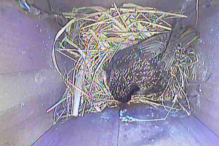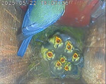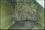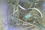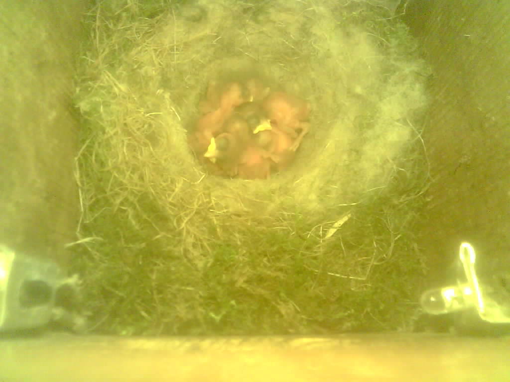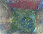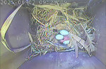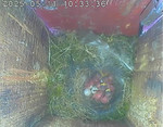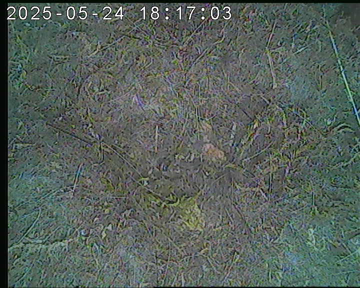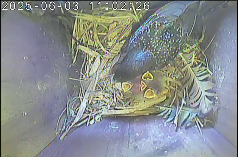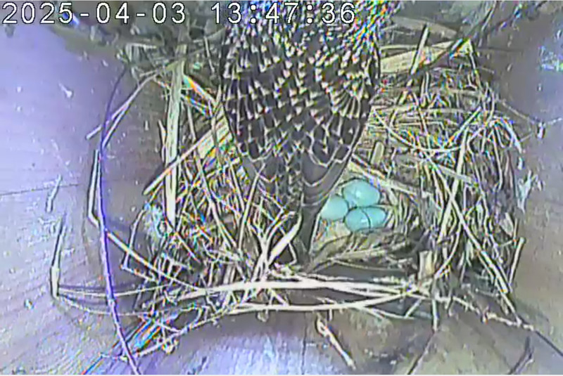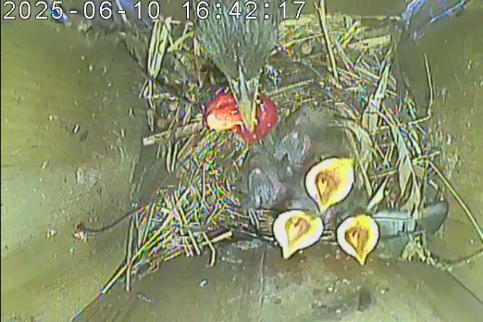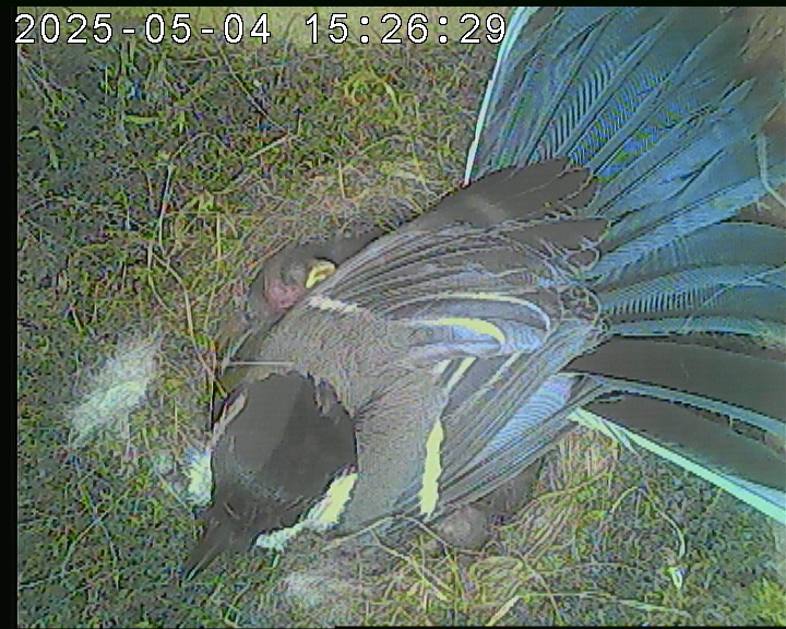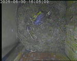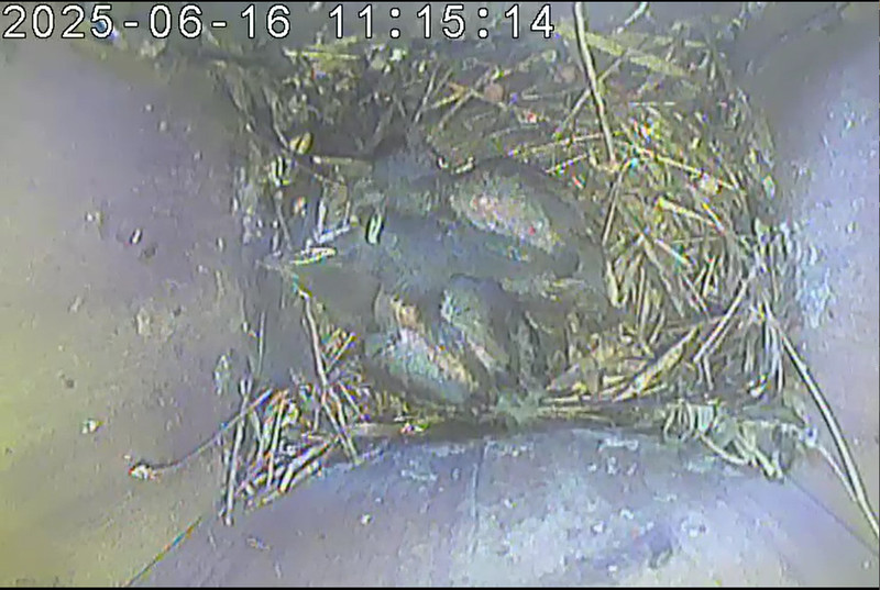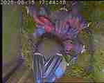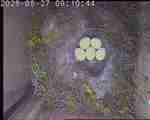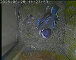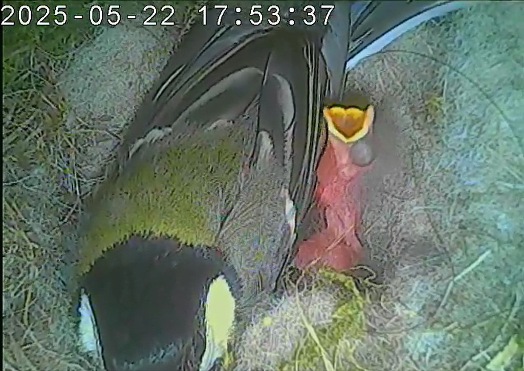 Der Boden ist vollständig mit Moos ausgelegt. Es liegen zwölf Eier im Nest. Die Jungvögel sind geschlüpft. Vom 09.05.2025 15:20 Uhr bis 11.05.2025 10:34 Uhr gab es eine technische Störung, daher die Lücke. Am 24.05.2025 lagen nur noch vier tote Jungvögel im Nest. Vermutlich gab es einen Prädator-Angriff.