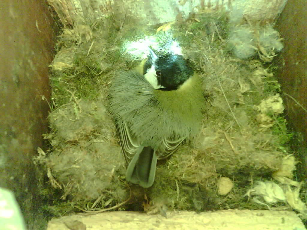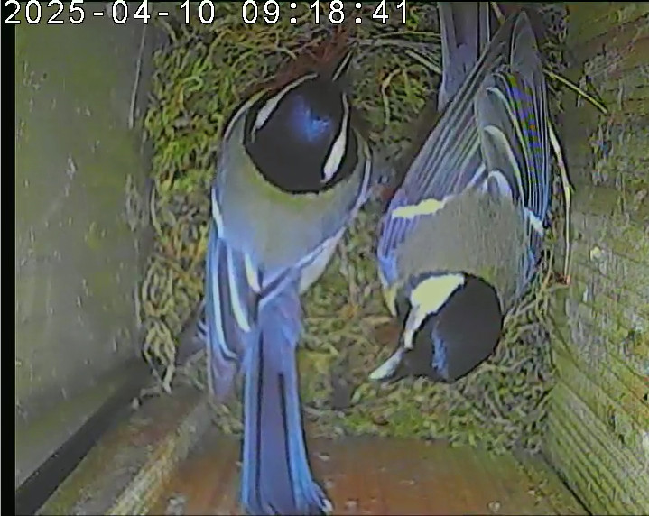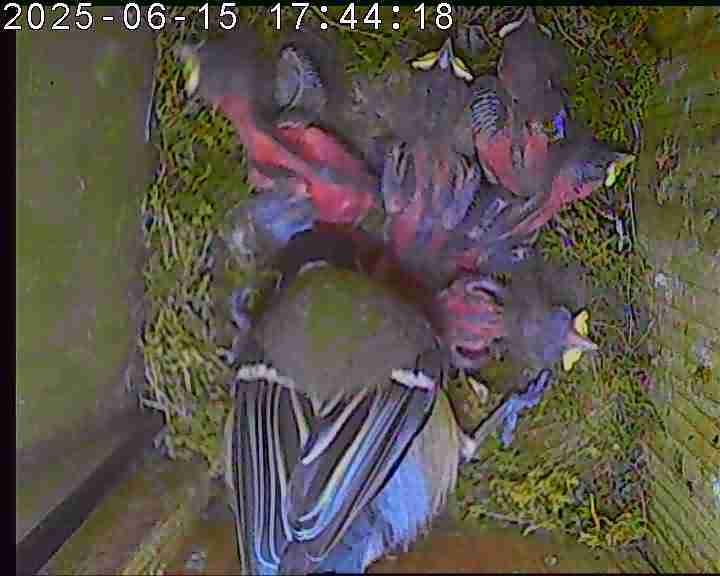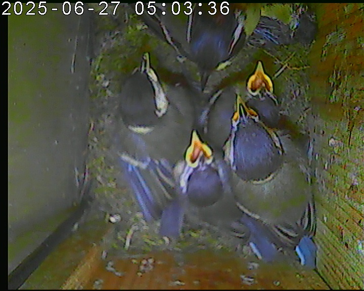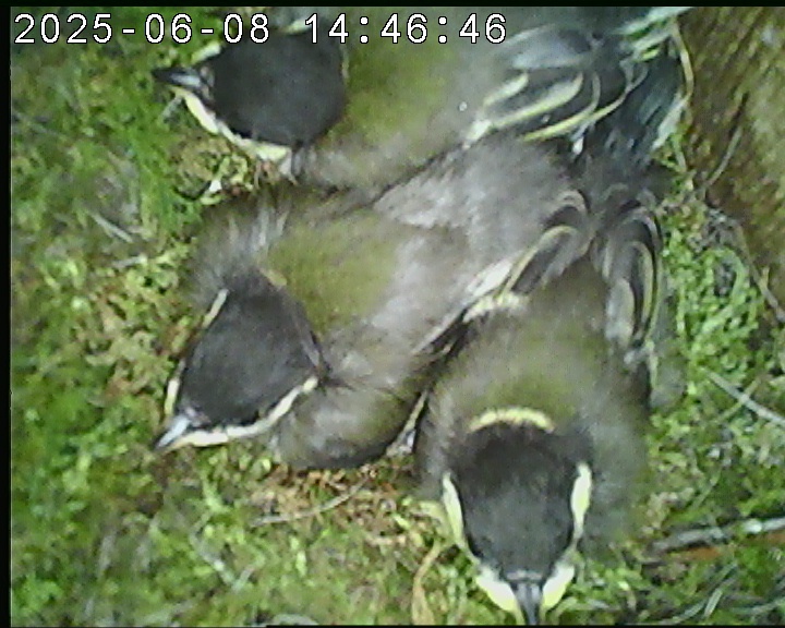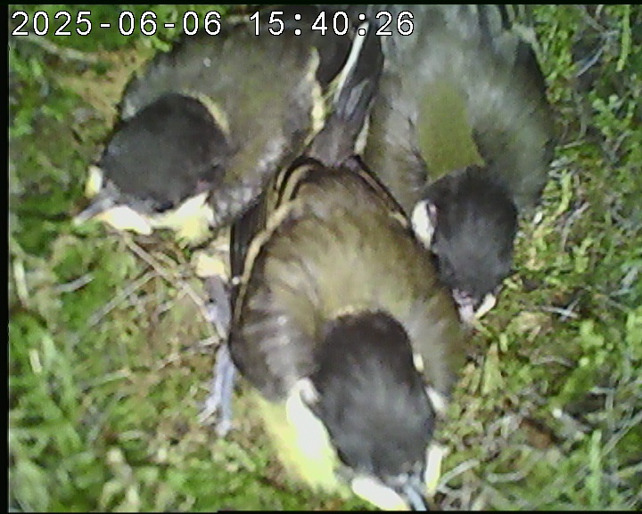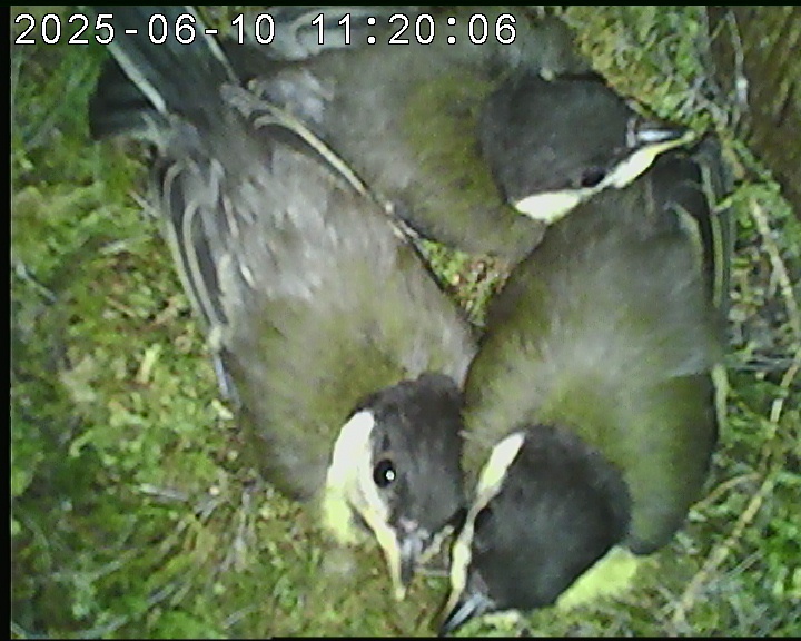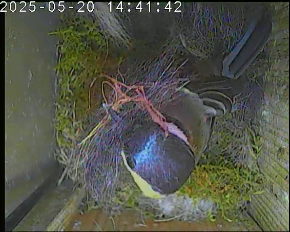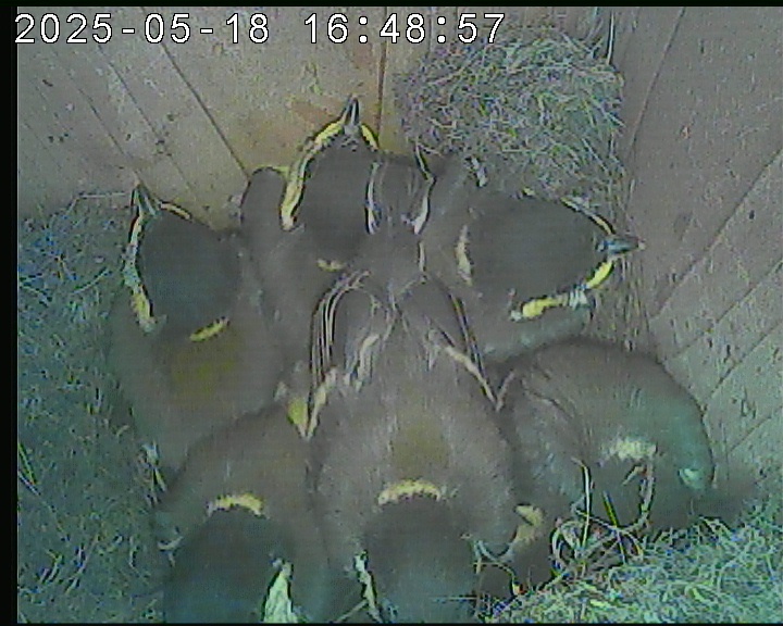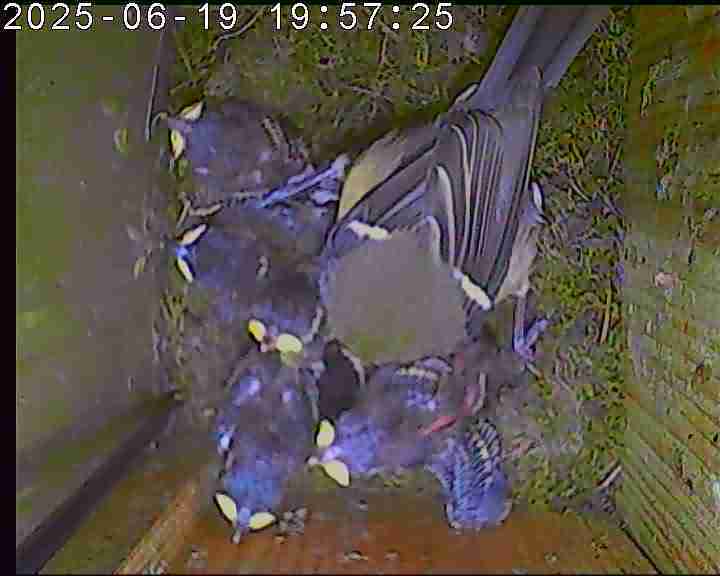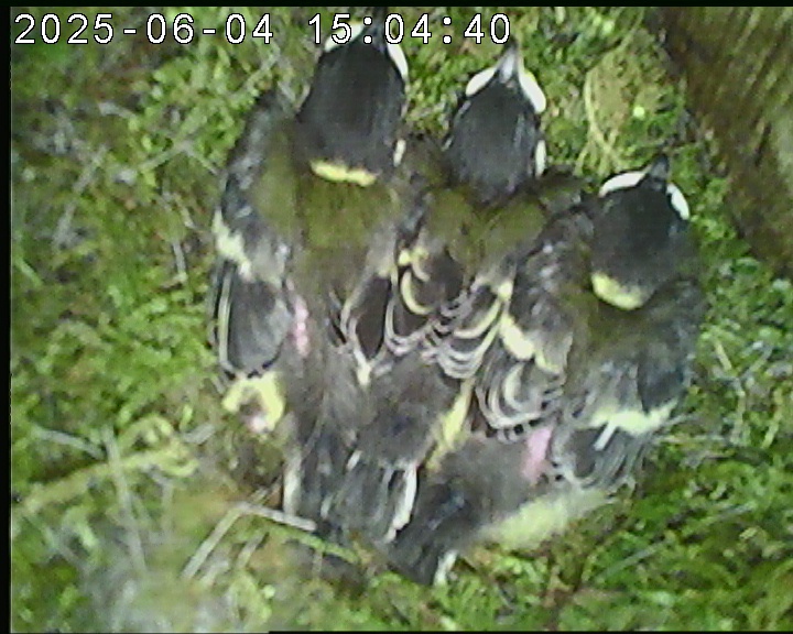Das alte Nest wurde am 08.02.2025 beseitigt und der Nistkasten gereinigt. Die Kohlmeisen haben acht Eier gelegt. Am 21.05.2025 um 19:00 Uhr ist der erste von sieben Jungvögeln geschlüpft. Am 02.06.2025 lebten noch sechs bis um 20:38 Uhr ein Angriff erfolgte. Den Angriff überlebten drei Jungvögel. Diese sind ausgeflogen.