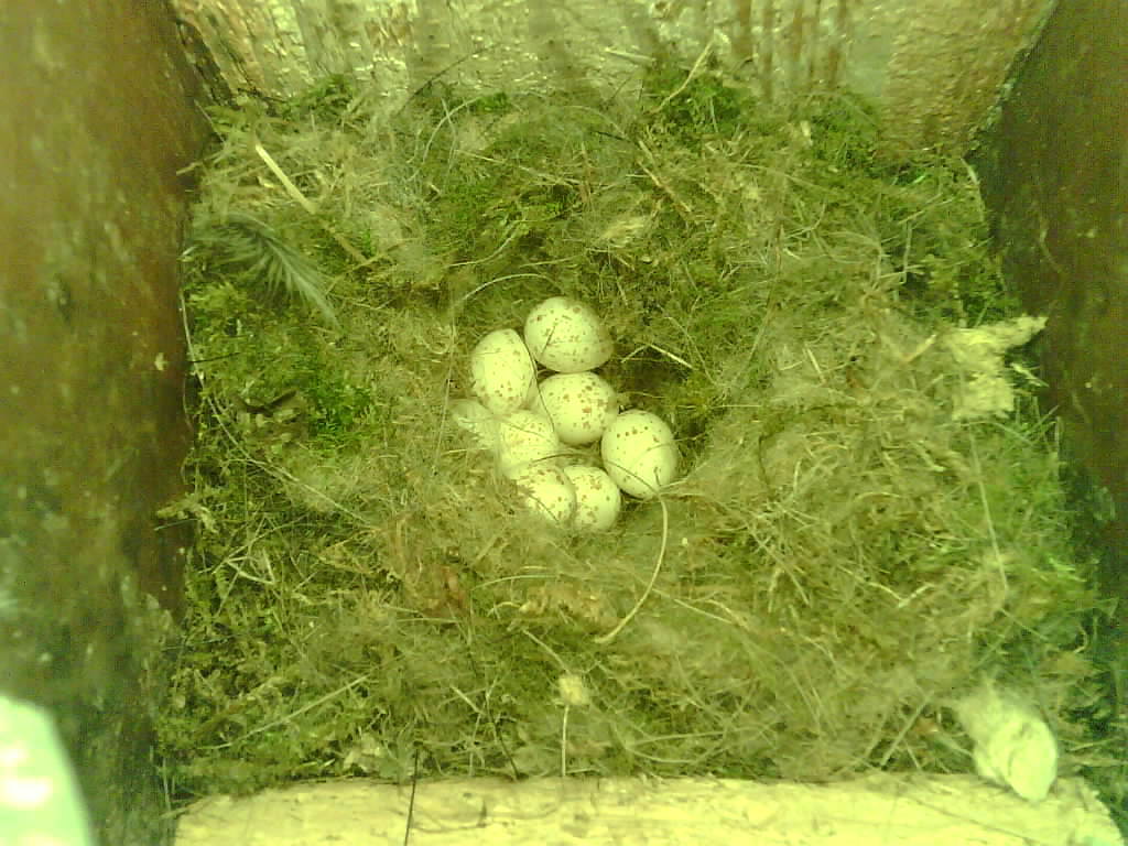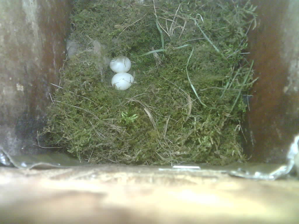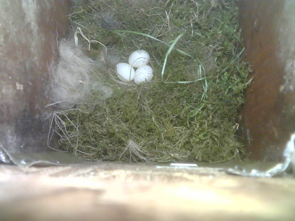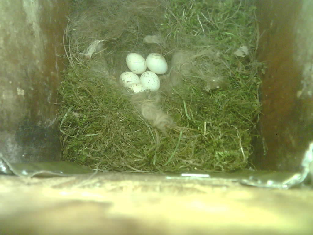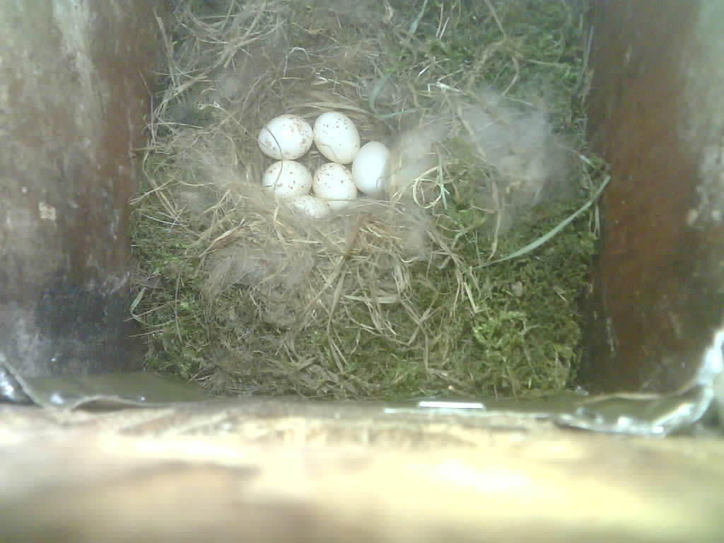 Der Nistkasten war in 2024 nicht belegt. Jetzt ist der Boden des Nistkastens vollständig mit Moos bedeckt. Im Nest liegen sechs Eier. Die Kohlmeisen brüteten zwei Tage lang und haben dann ist das Gelege verlassen.