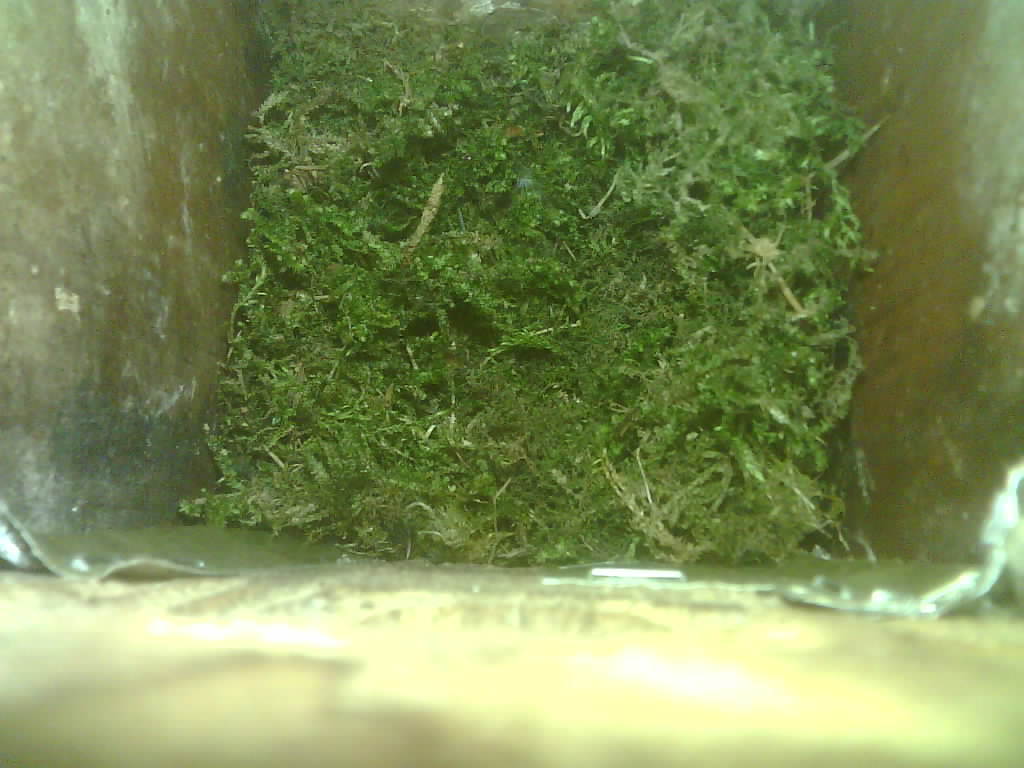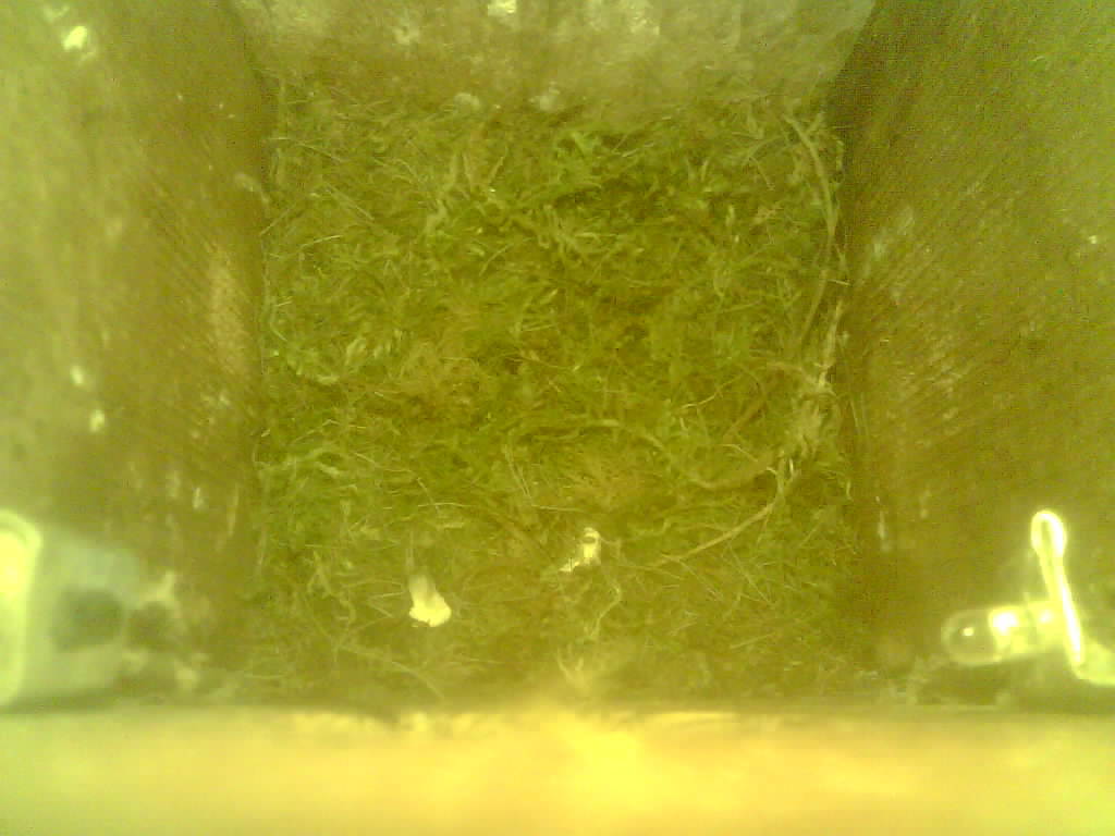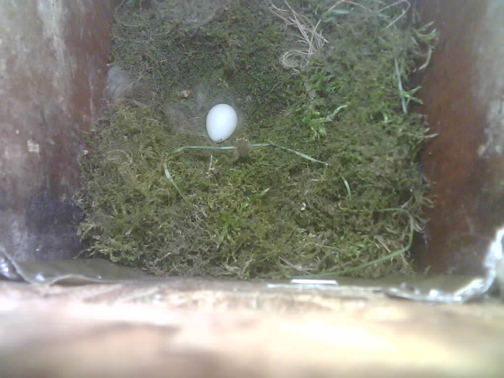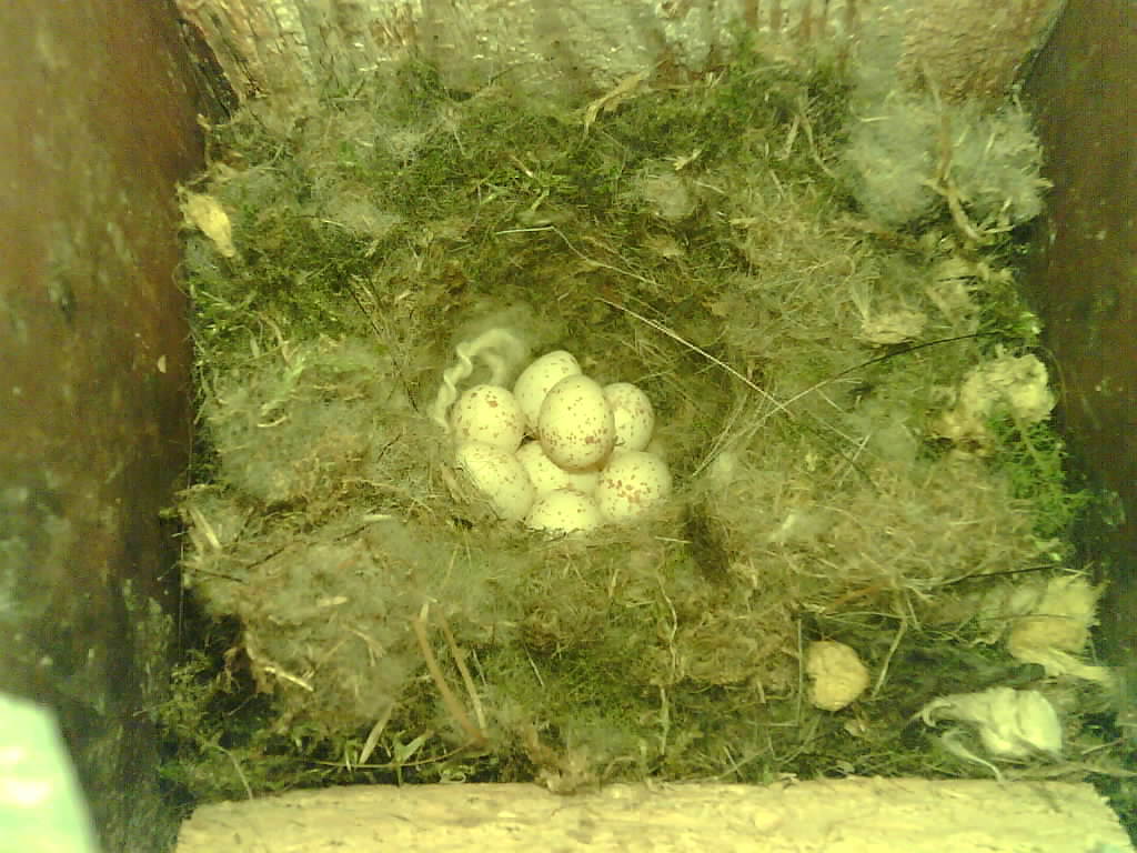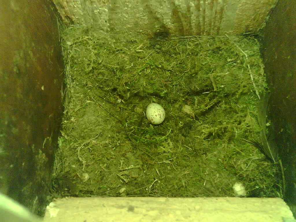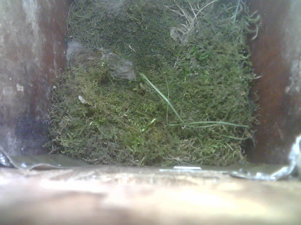 Der Nistkasten war in 2024 nicht belegt. Jetzt ist der Boden des Nistkastens vollständig mit Moos bedeckt. Im Nest liegen sechs Eier. Die Kohlmeisen brüteten zwei Tage lang und haben dann ist das Gelege verlassen.