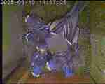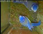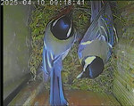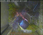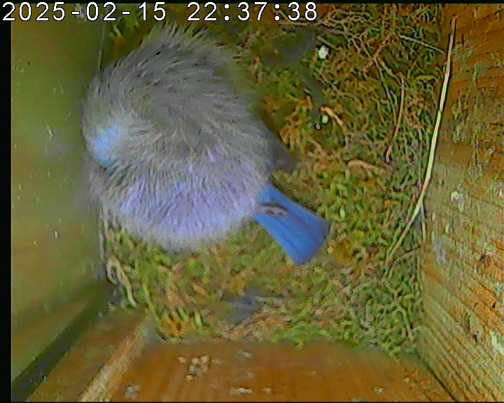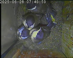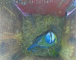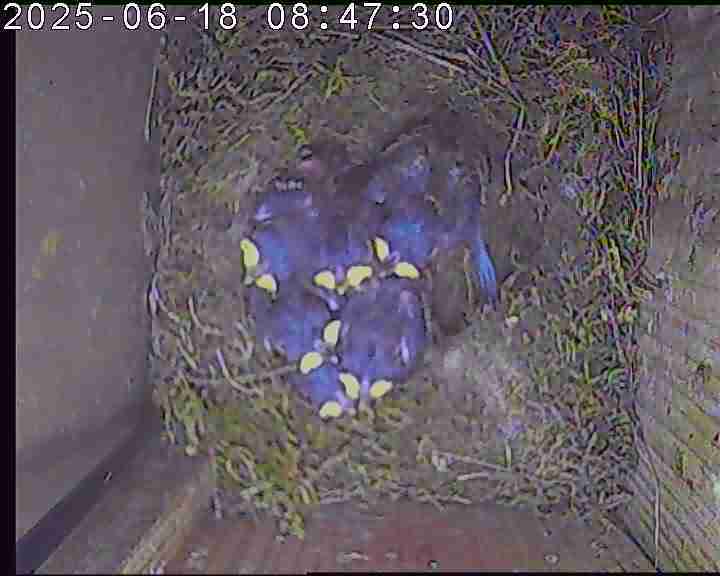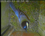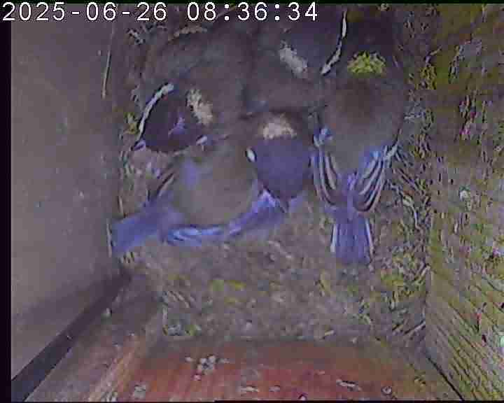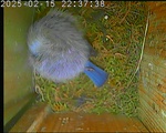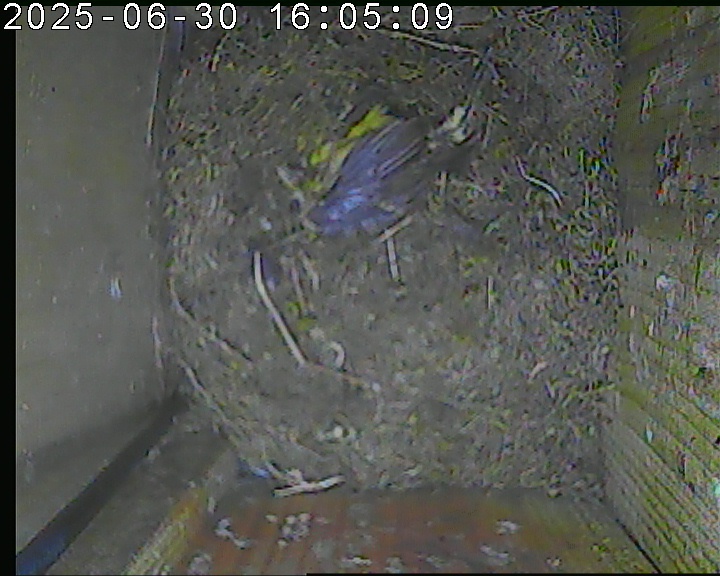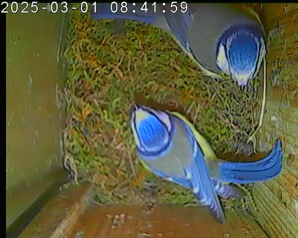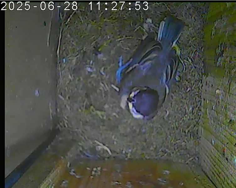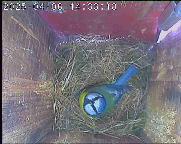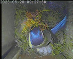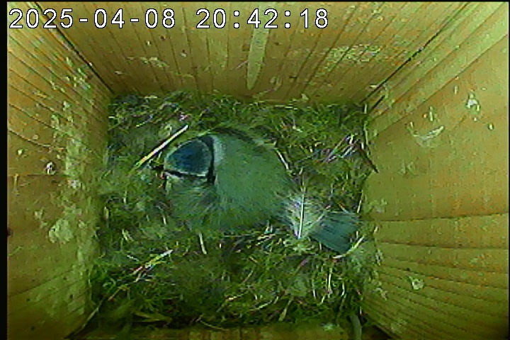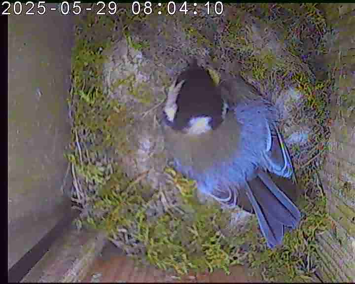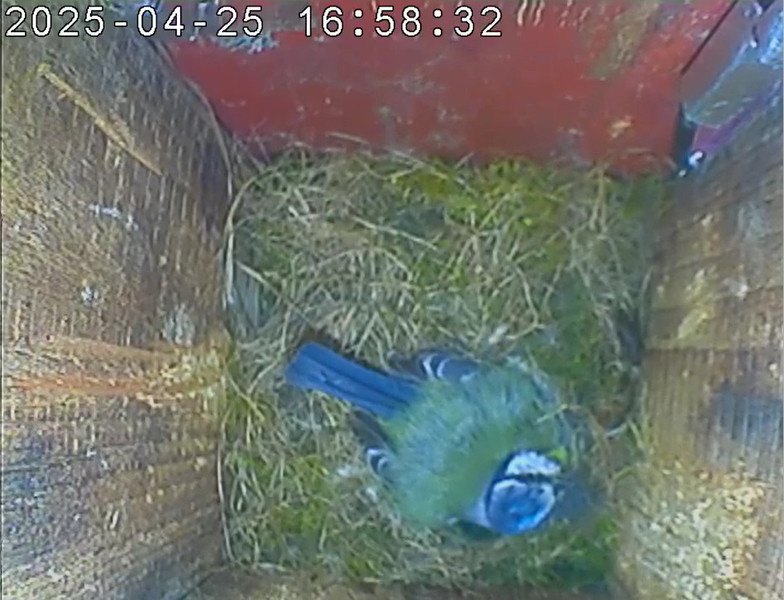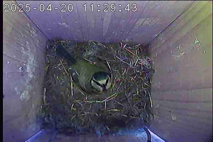 Das alte Nest wurde am 08.02.2025 beseitigt und der Nistkasten gereinigt. Der Boden ist jetzt vollständig mit Moos bedeckt. Eine Blaumeise übernachtet im Nistkasten. Die Blaumeisen haben zehn Eier gelegt. Neun Jungvögel sind geschlüpft. Alle Jungvögel sind am 21.05.2025 ausgeflogen, der letzte um 07:15 Uhr. Ein Ei lagt noch im Nest. Es wurde entfernt. Tagsüber schäft manchmal ein Siebenschläfer im Nistkasten.