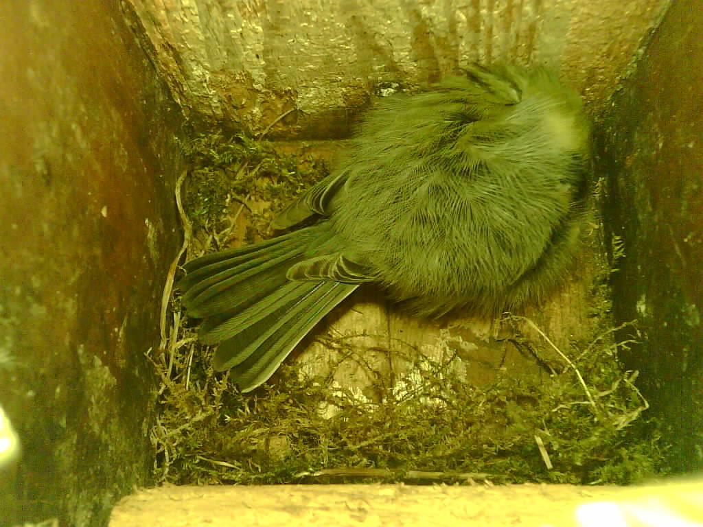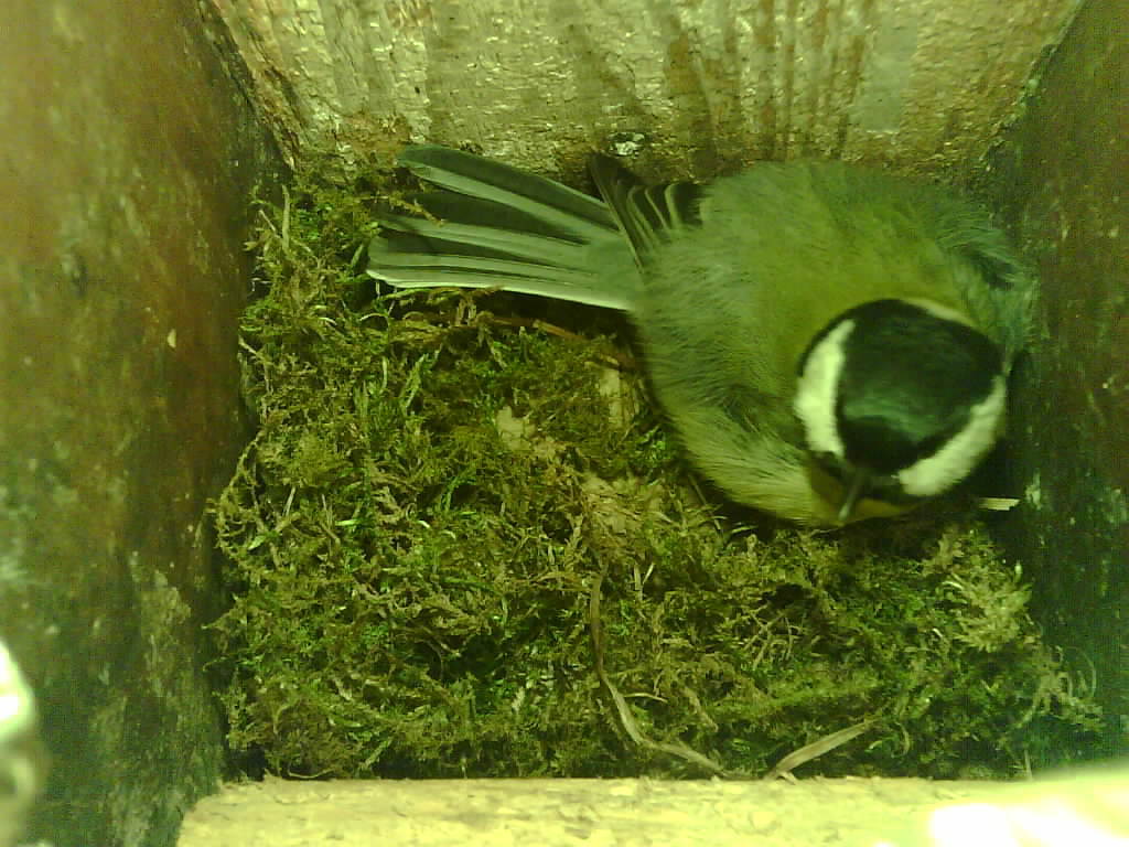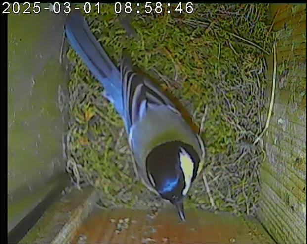 Vom 19.11.2024 bis 19.04.2025 übernachtete eine Kohlmeise jede Nacht im Nistkasten. Das alte Nest wurde am 08.02.2025 beseitigt und der Nistkasten gereinigt.