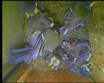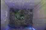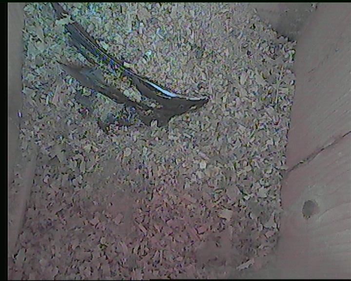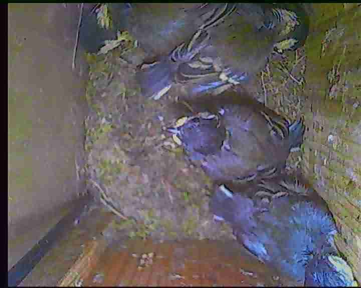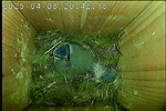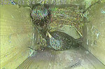 NK05: Die jungen Stare sind 23 und 24 Tage alt und fliegen aus. Bei den Innenaufnahmen ist das Einflugloch oben. Dorthin verlassen die jungen Stare den Nistkasten. Die Außenkamera zeigt wie die Jungvögel wegfliegen.