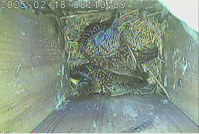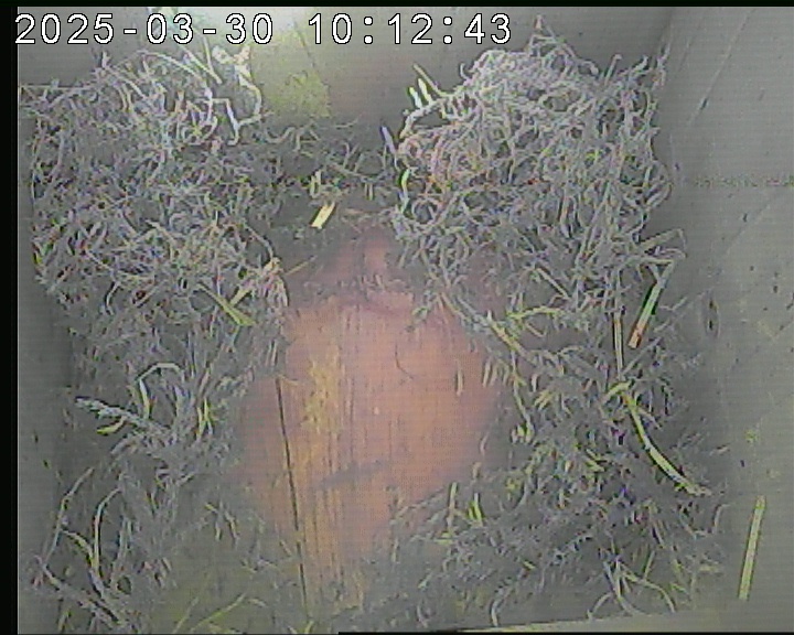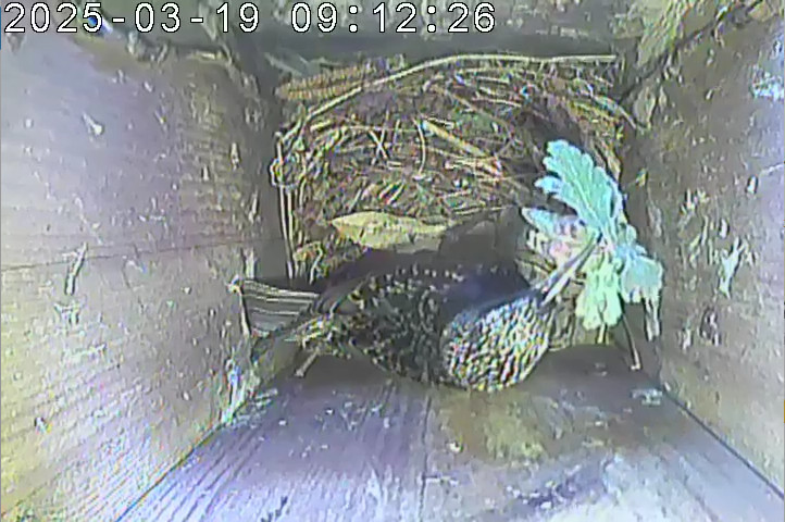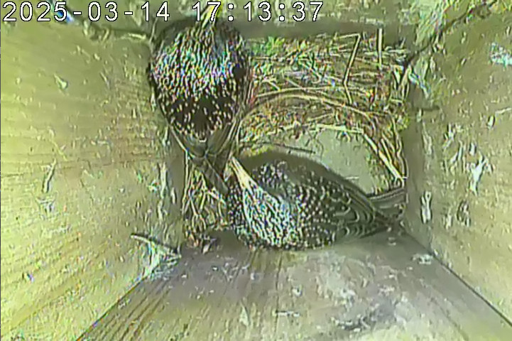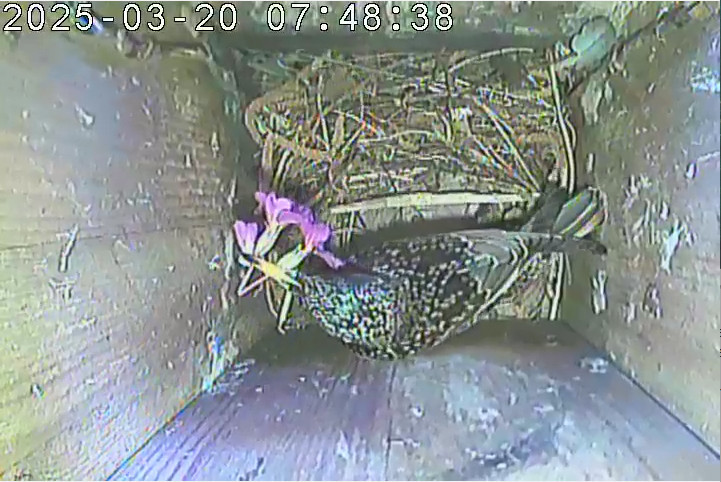 Seit 06.03.2025 transportieren die Stare neues Nestmaterial in den Nistkasten. Das erste Ei wurde am