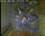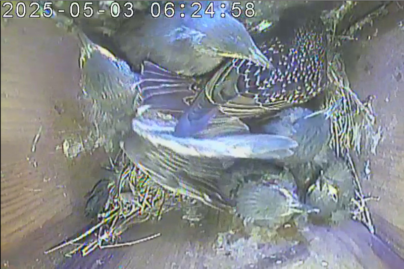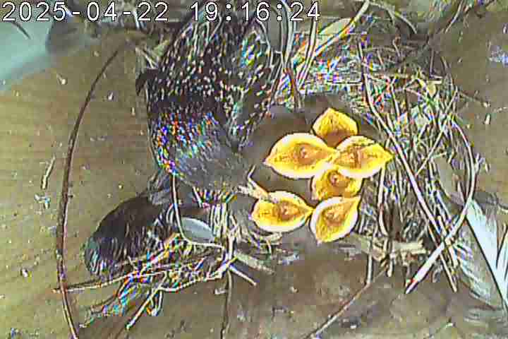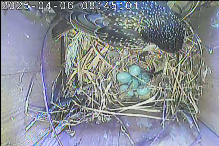 02.04.2025 gelegt. Insgesamt legten die Stare sechs Eier. Sechs Jungvögel schlüpften. Sie flogen am 08.05.2025 um 05:55, 07:52, 08:22, 11:29, 12:02 und 12:05 Uhr aus.