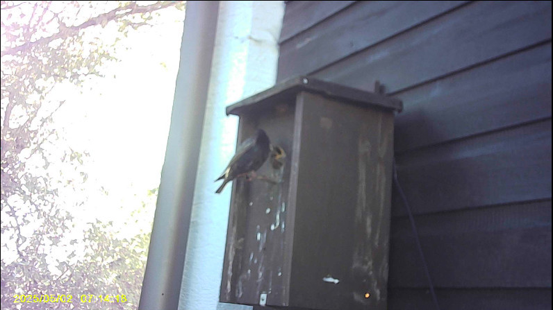 Der erste Star (Männchen) kam am 08.02.2025 in den Nistkasten. Er beseitigte das alte Nestmaterial vom Vorjahr und war damit bis zum 25.02.2025 beschäftigt. Ein weiterer Star, vermutlich das Weibchen, kam manchmal in den Nistkasten ohne etwas zu tun. Ab 06.03.2025 wird neues Nestmaterial in den Nistkasten transportiert. Das erste Ei wurde am 02.04.2025 zwischen 07:37 und 08:14 Uhr gelegt. Die Stare haben sechs Eier gelegt. Am 17.04.2025 schlüpften daraus sechs junge Stare. Alle sechs Jungvögel überlebten. Sie am 08.05.2025 um 05:55, 07:52, 08:22, 11:29, 12:02 und 12:05 Uhr ausgeflogen. Ab 15.05.2025 transportieren die Stare wieder Material in den Nistkasten. Am 19.05.2025 legten die Stare vier Eier aus denen am 02.06.2025 vier junge Stare schlüpften. Am 08.06.2025 starb ein Jungvogel. Am 22.06.2025 starben weitere zwei Jungvogel. Der einzige überlebende Jungvogel flog am 23.06.2025 aus. Die beiden toten Jungvögel wurden aus dem Nest entfernt.