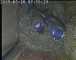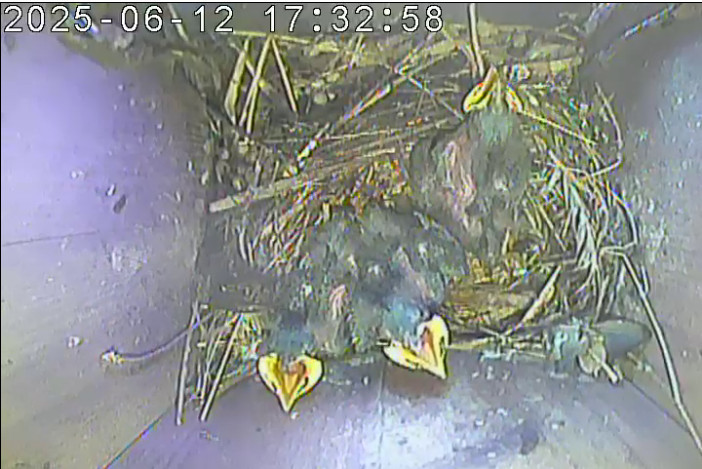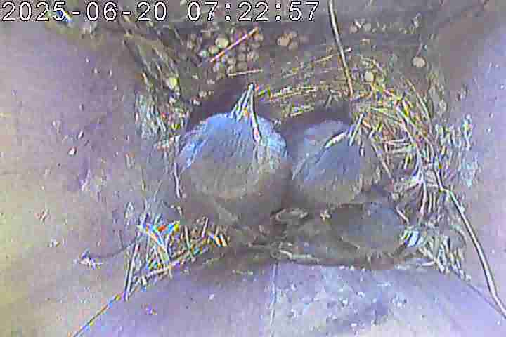 In der zweiten Brut legten die Stare vier Eier. Am 02.06.2025 schlüpften die Jungen. Am 08.06.2025 starb ein Jungvogel. Am 22.06.2025 starben zwei weitere. Der einzige Überlebende flog am 23.06.2025 aus.