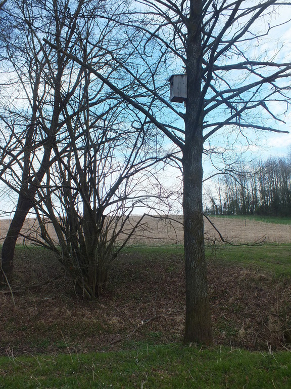 Der Nistkasten ist ca. 5 Meter hoch oben an einem Baum befestigt. Im Nistkasten liegen Späne, die bei der Installation dort eingebracht wurden.