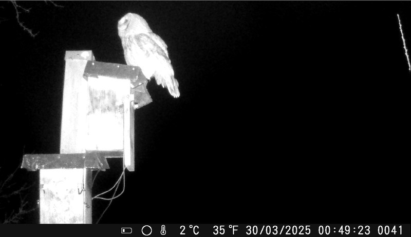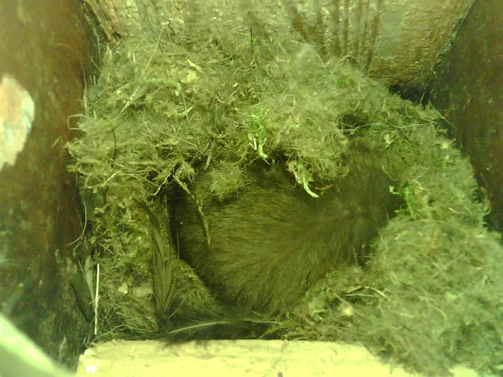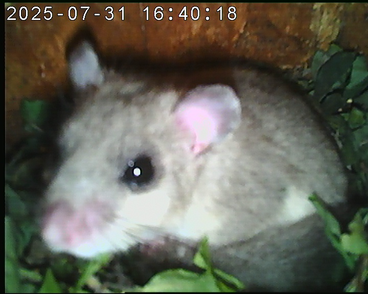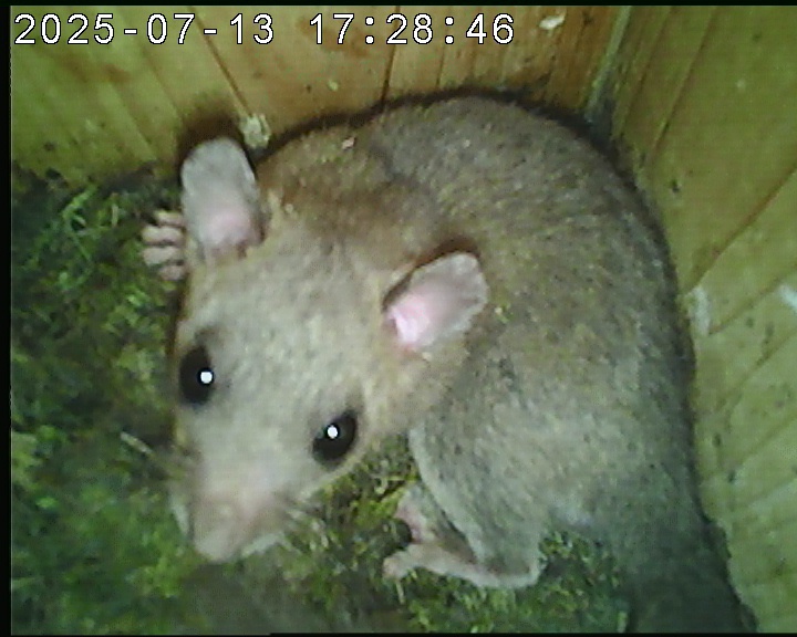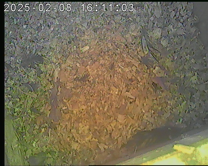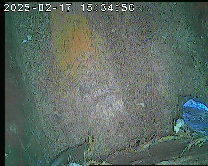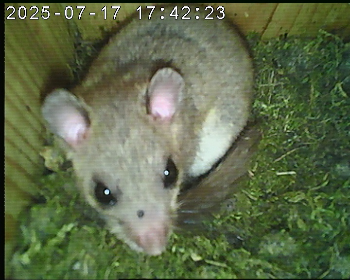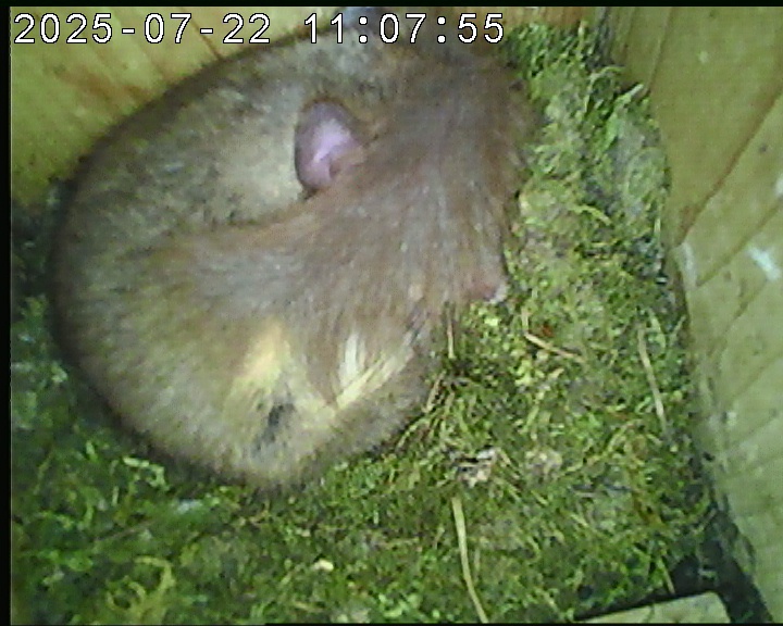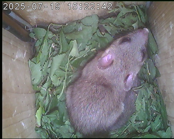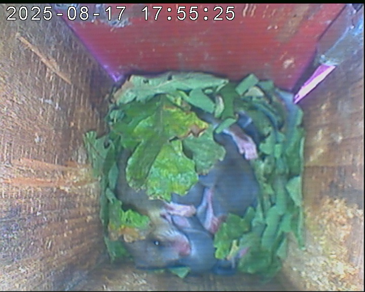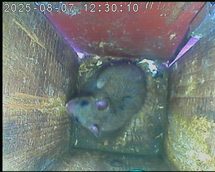 Das alte Nest wurde am 08.02.2025 beseitigt und der Nistkasten gereinigt. Es wurde eine manuell bedienbare Kamera eingebaut. Regelmäßig schläft ein Siebenschläfer tagsüber im Nistkasten.