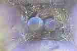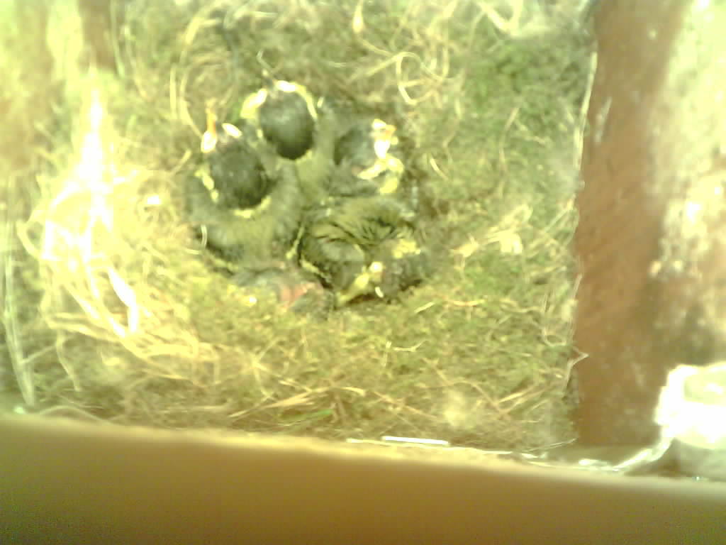 Das dritte Blaumeisen-Junge ist geschlüpft. Die Eierschalen werden vom Weibchen verspeist. Das Männchen füttert die jungen Blaumeisen.