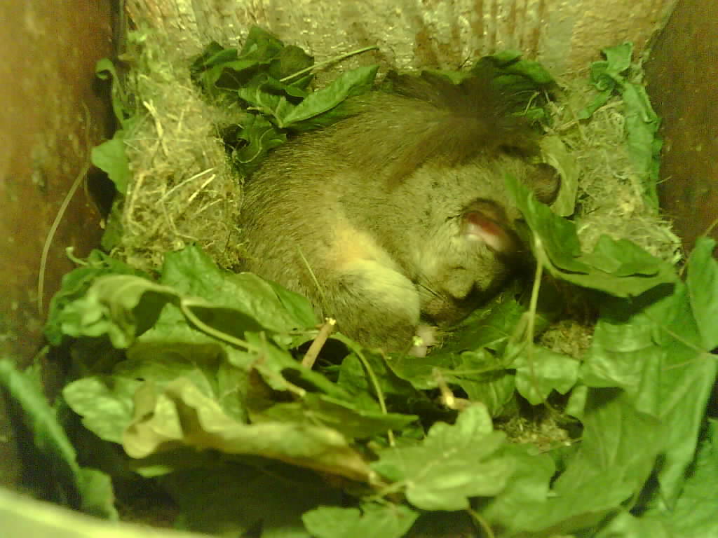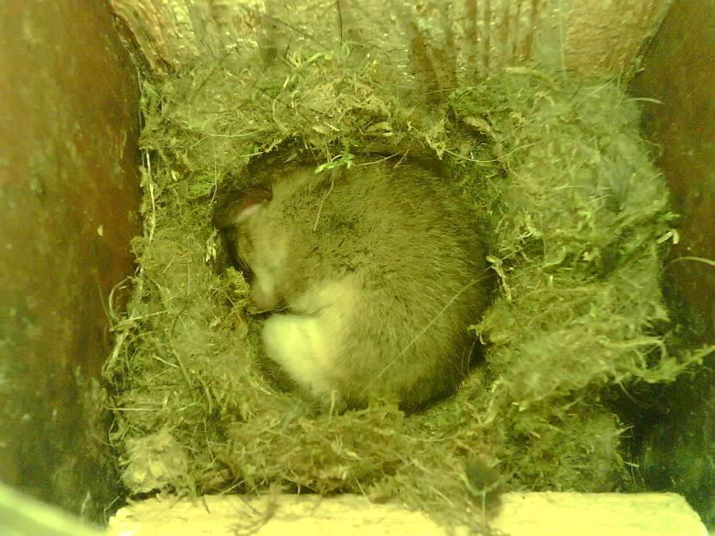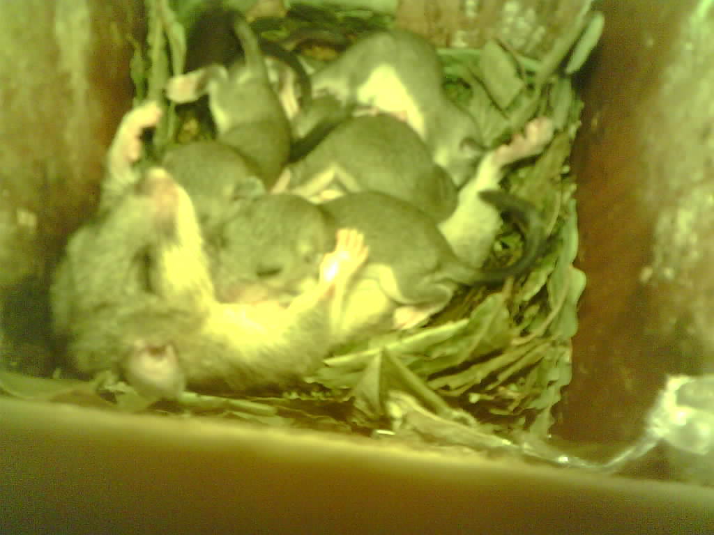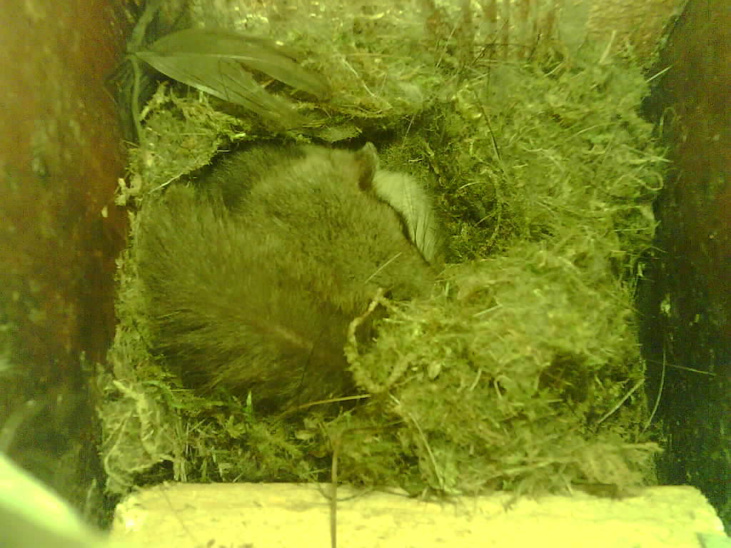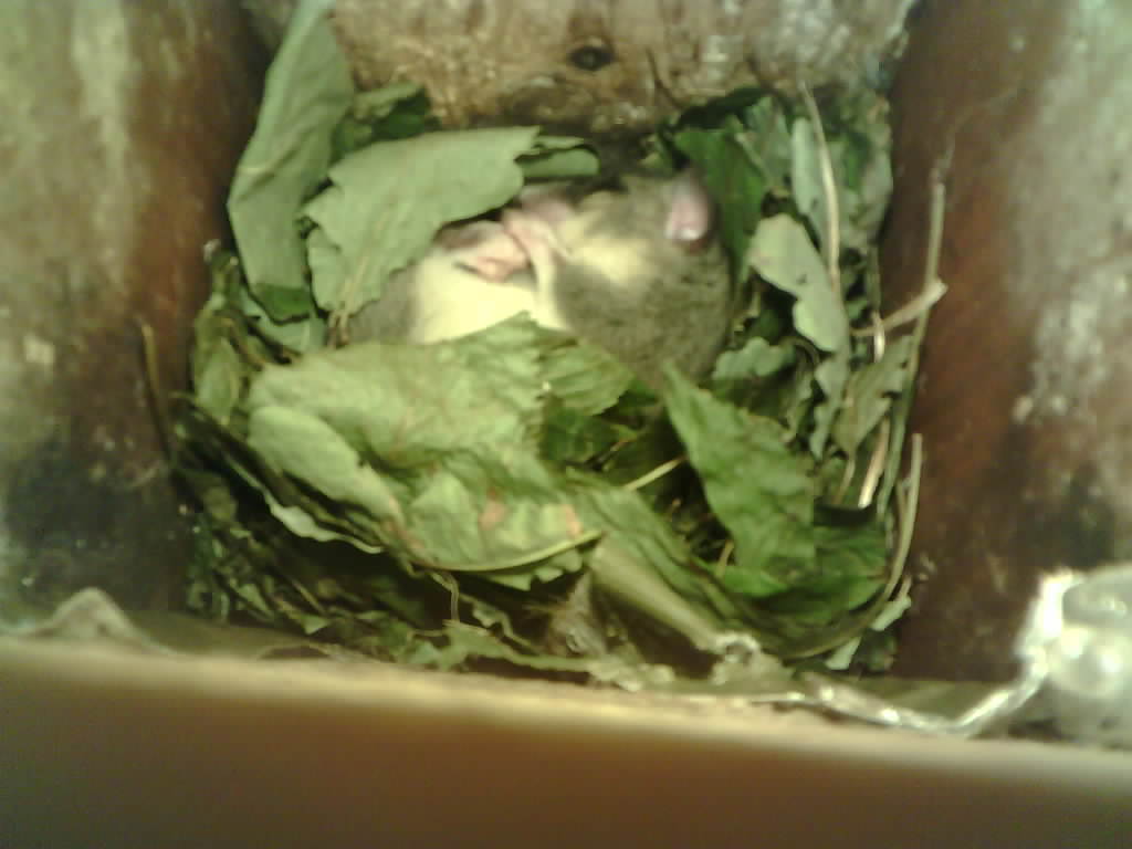 Der Siebenschläfer im Nistkasten hat vier Junge und säugt die 9 Tage alten Jungtiere.