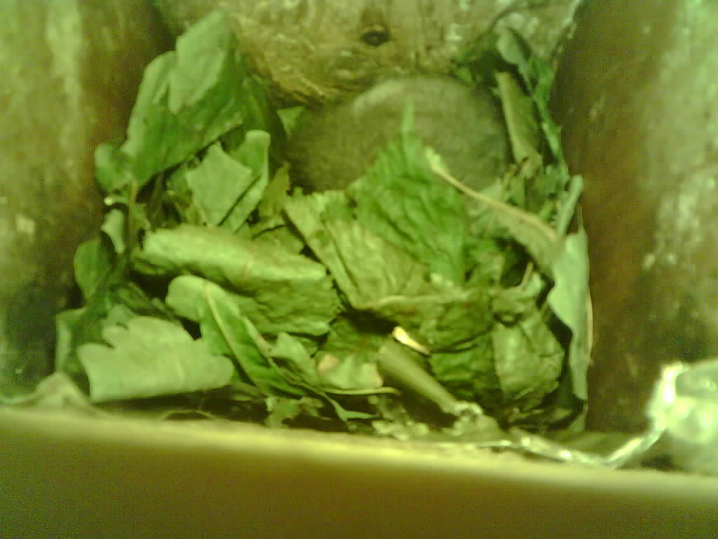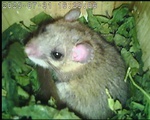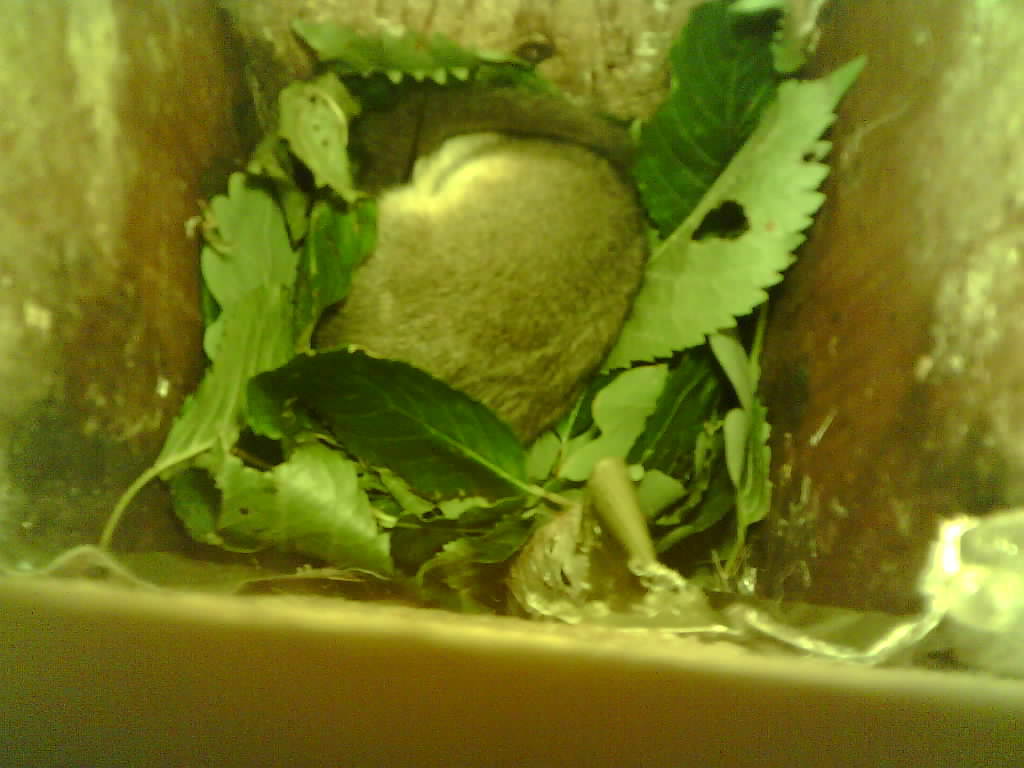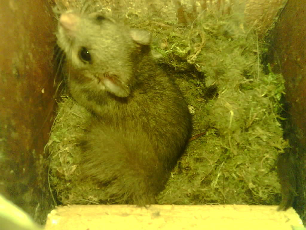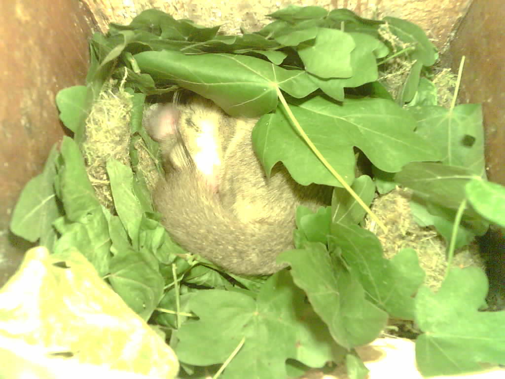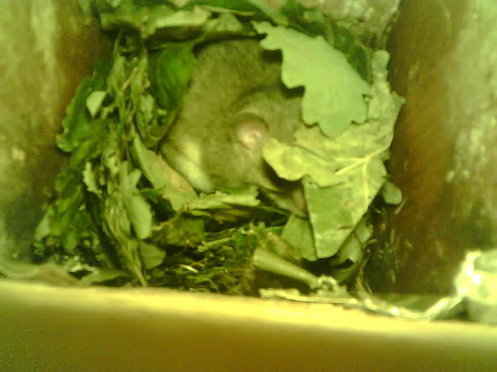 Der Siebenschläfer im Nistkasten hat vier Junge und säugt die 9 Tage alten Jungtiere.