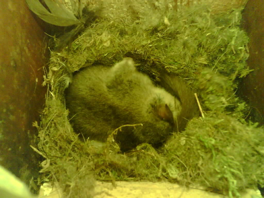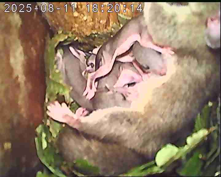 Die Brutsaison der Kohlmeisen ging im Mai zu Ende. Als Nachmieter ziehen manchmal Siebenschläfer ein. Dieser Siebenschläfer bezog den Nistkasten im LBV-Biotop Bonstetten am 28. Juli und hat acht Junge geboren. Die zwei Tage alten Siebenschläfer sind blind und finden dennoch die Milchdrüsen des Muttertieres. Acht Jungtiere sind ungewöhnlich viel. Meist sind es nur vier bis sechs.
