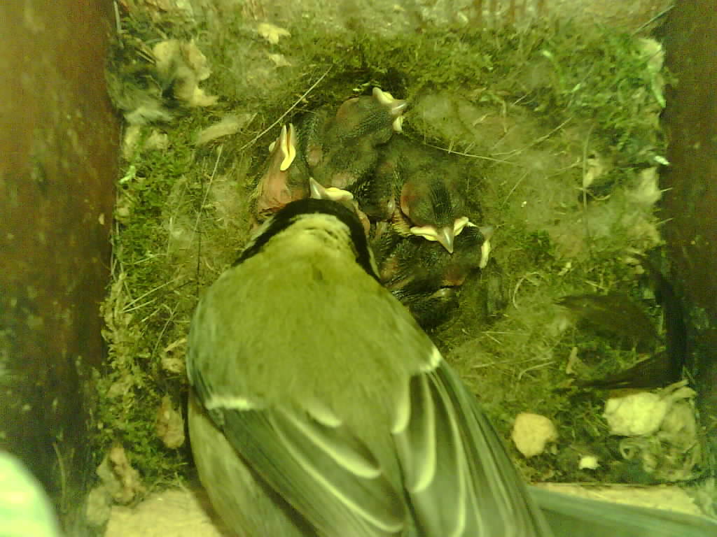Die zehn jungen Kohlmeisen sind sechs Tage alt und werden gefüttert. Der Kot eines Jungvogels wird nach außen getragen.