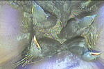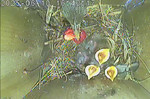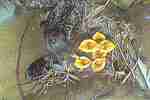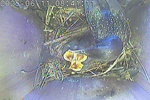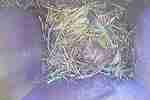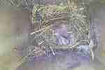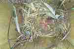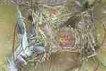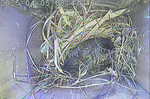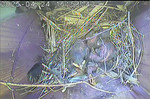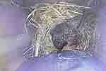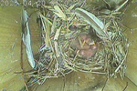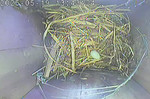 Das Weibchen füttert einen sechs Tage alten Jungvogel mit einem Grashalm. Der Altvogel transportiert den Kot der Jungvögel nach außen.
