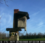 Das alte Nest wurde am 08.02.2025 beseitigt und der Nistkasten gereinigt. Jetzt ist der Boden des Nistkasten vollständig mit Moos bedeckt. Im Nest liegen 12 Eier. Neun Jungvögel sind geschlüpft. Am 22.05.2025 waren noch sieben Junge zu sehen. Am 24.05.2025 lagen noch noch vier tote Jungvögel im Nest. Vermutlich gab es in der Nacht einen Angriff. Am 14.08.2025 hat ein Siebenschläfer Blätter in der Nistkasten transportiert. Am 15.08.2025 ist der Siebenschläfer mit seinen sechs Jungen vom Nistkasten NK_D3 hierher umgezogen.