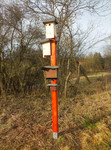 Der Nistkasten NK_D2 befindet sich ebenfalls außerhalb des Ortes und ist an einer Stange in ca. 5 Metern Höhe befestigt. Die äußeren Lichtschranken des Nistkastens NK_D2 sind sichtbar. Die Innenkamera wird manuell aktiviert. Das vergrößerte Einflugloch wurde mit einer Blende auf 32mm Durchmesser verkleinert.